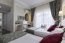 Nearest airport: BUD. All the elegance is made avaliable for you in Alaiye Kleopatra Hotel. A deep blue sea , unique to Mediterranean is waiting for you. Relax yourself in the middle of shining sun, scorching sand and snow-white waves with your loved ones.##Rooms* The hotel consist of 107 hotel rooms and 15 apart rooms. * Standart Room 1 75 Rooms / 16 m2. Orthopedic bed, satellite TV, 37 screen TV, direct line telephone, minibar, split air conditioning, bathroom, bathtub, hairdryer, safety box, balcony are available.* Standart Room 2 10 Rooms / 16 m2. Orthopedic bed, satellite TV, 37 screen TV, direct line telephone, minibar, split air condition, bathroom, bathtub, hairdryer, safety box, and balcony are available.* Standart Room 3 4 Rooms / 16 m2. Orthopedic bed, satellite TV, 37 screen TV, direct dial phone, minibar, split air conditioning, tile floor, bathroom, bathtub, hairdryer, balcony are available. * Family Room 10 Room / 32 m2. Orthopedic bed, satellite TV, 37 screent TV, direct dial phone, minibar, split air conditioning, tile floor, bathroom, bathtub, hairdryer, safety box, balcony are available. * Connected Room 4 Rooms / 32 m2. Orthopedic bed, satellite TV, 37 screen TV, direct dial phone, minibar, split air conditioning, tile floor, bathroom, bathtub, hairdryer, safety box, and balcony are available.* Honeymoon Room 2 Rooms / 16 m2. Orthopedic bed, satellite TV, 37 screen TV, direct dial phone, minibar, split air conditioning, tile floor, bathroom, bathtub, hairdryer, safety box, balcony, bathtub with jacuzzi are available.* Apart Room 15 Room / 40 m2. Orthopedic room, satellite TV, 37 screen TV, direct dial phone, minibar, split air condition, tile floor, bathroom, bathtub, hairdryer, safety box, balcony, other room used with one bedroom and kitchen, all kitchen equipment, electrical cooker, and kettle are available.* Disabled Room 2 Room / 16 m2. Orthopedic bed, satellite TV, 37 screen TV, direct dial phone, minibar, split air conditioning, tile floor, bathroom, bathtub, hairdryer, safety box, balcony are available. All details are taken into consideration for the handicapped guests.##OtherInformation* If eating is a indispensible part of holiday for you too Alaiye Kleopatra Hotel is the right adress. You can taste the delicious food of Turkish and International Cuisines in Kleopatra Restaurant. * The hotel has 3 bars as Pool Bar, Beach Bar and Alaiye Bar where you will drink your beverages pleasantly.* Besides you can keep your physical fitness in the fitness center. You can free yourself from the stress of day with Turkish bath.* The hotel offers you a memorable holiday with surprise parties and entertainment in the evenings that prepare for you.* Game saloon, sauna, night shows, table tennis, pools, water sports, outdoor pool, indoor pool, children's pool, fax, laundry, dry cleaning, massage, billiards, internet are some of the facilities you can find in the hotel.##LocationAlaiye Kleopatra Hotel is located in Alanya. It is 5 minutes to the centre of Alanya, 55 km to Side, 70 km to Aspendos and 125 km to the Antalya Airport.The hotel is 100 m to the sea.