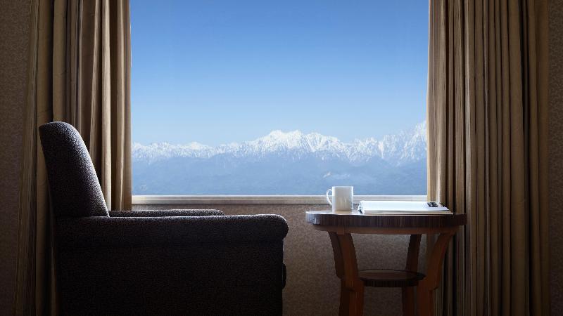 Nos dieron una habitación en la esquina por 1 noche y quedamos encantados con las vistas. Una de las ventanas contempla los Alpes japoneses y la otra ventana contempla el parque de las ruinas del...