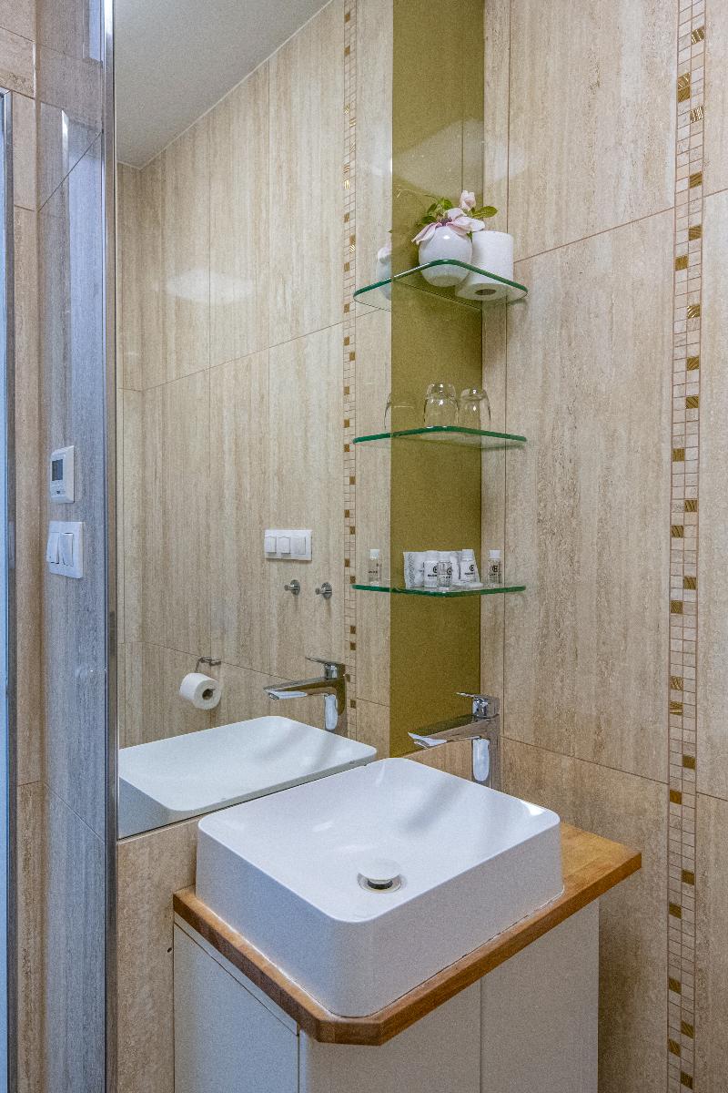 El baño un poco pequeño y no cuenta con plato de ducha sino directamente en el suelo.