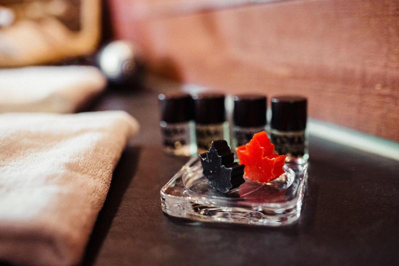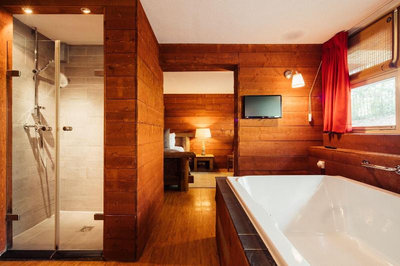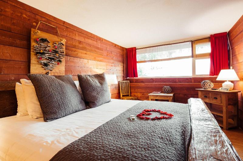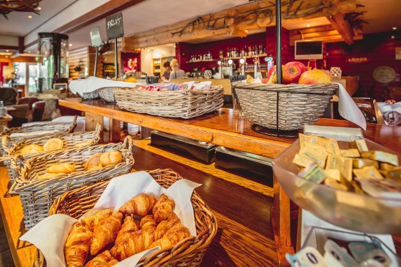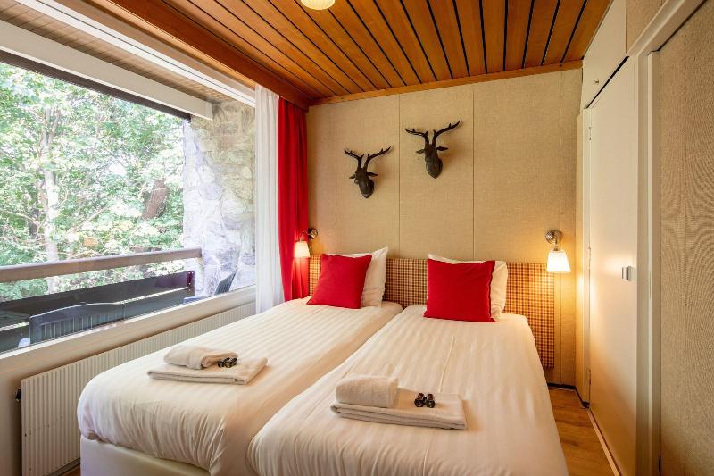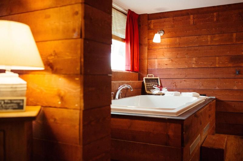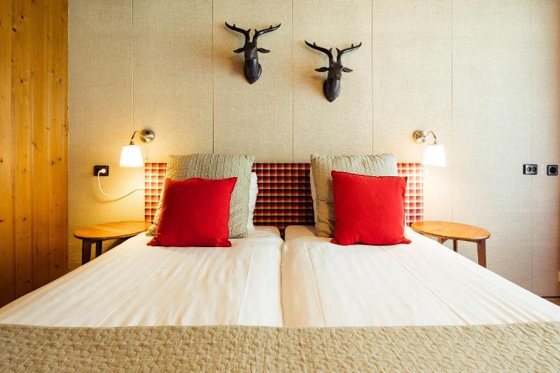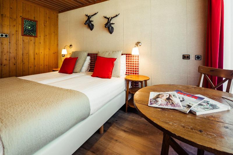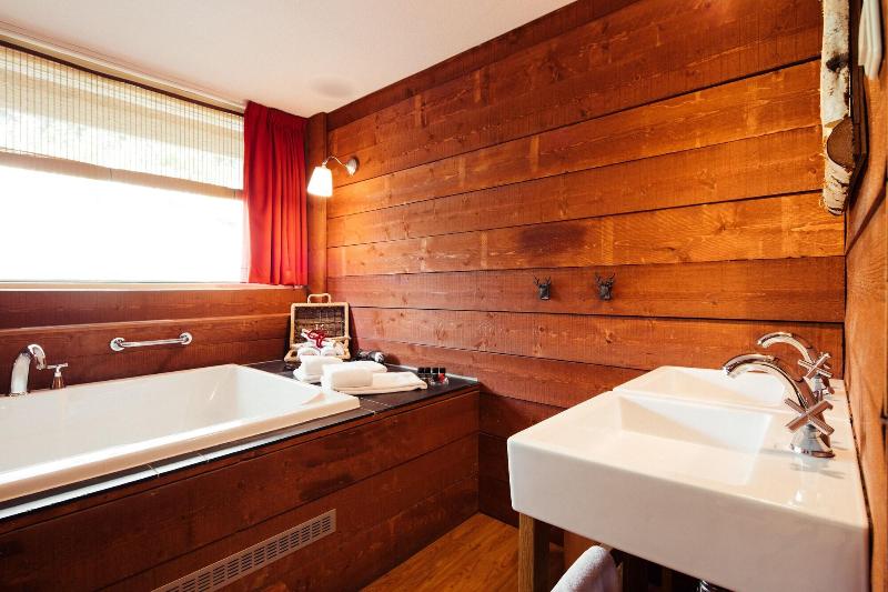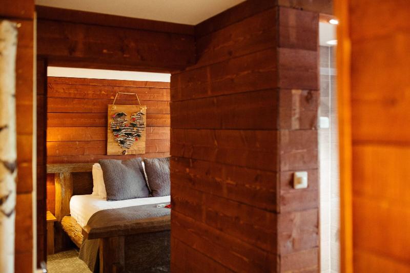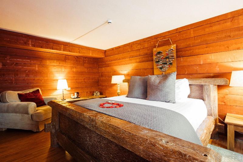 El hotel parece un refugio de montaña, todo decorado en madera y con motivos de...