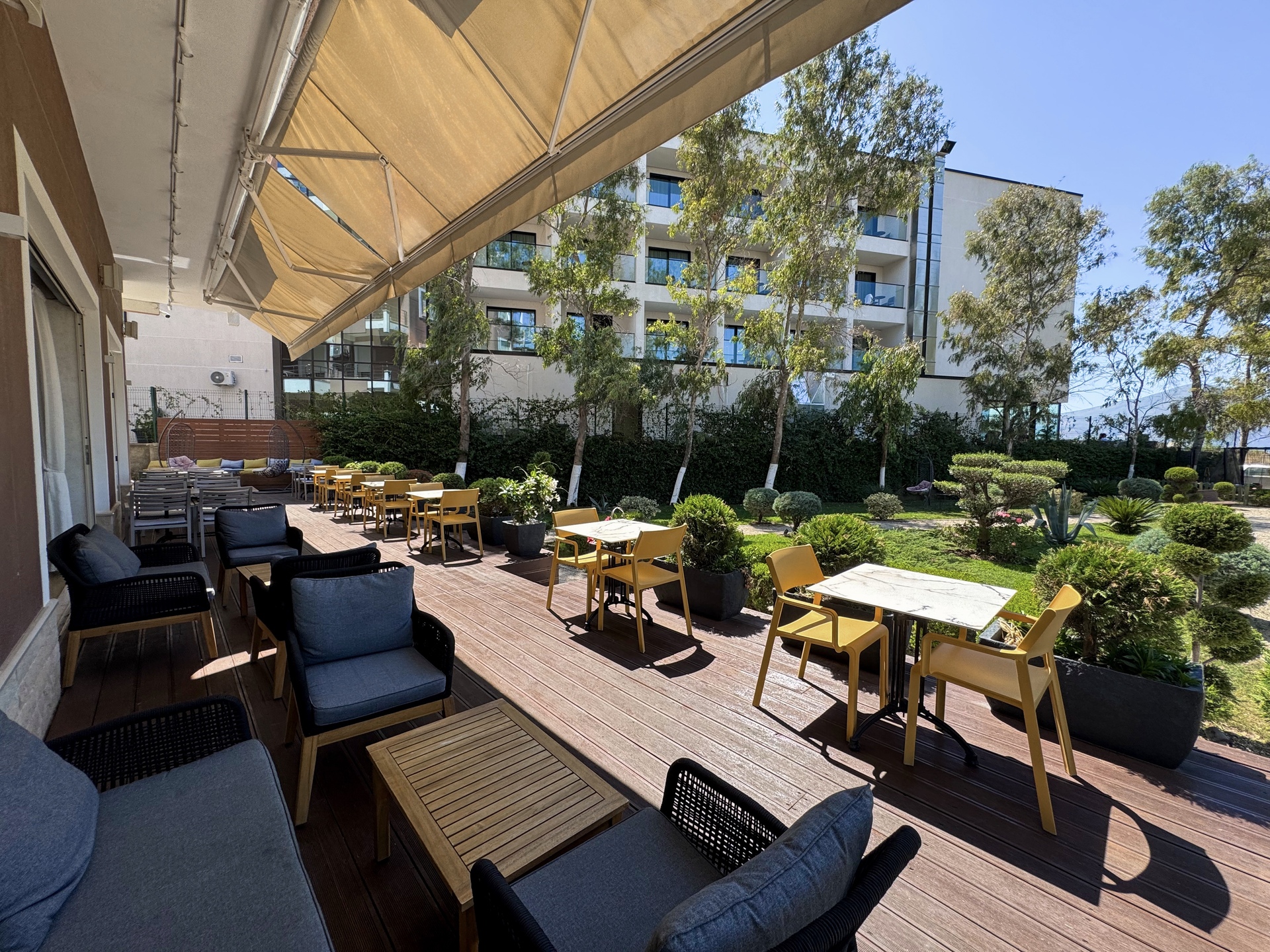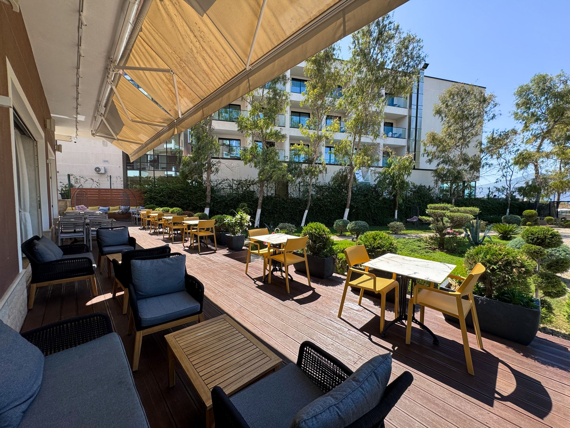 El alojamiento Bel Ami Suita Hotel está situado a unos 150 m de la playa. El casco histórico está a unos 1,5 km. A unos 50 m puede encontrarse un supermercado. La distancia hasta el aeropuerto es de unos 30 km. En la playa hay disponibles toallas de baño de pago. El hotel halal verificado por GPS cuenta con una recepción (posibilidad de registrarse las 24 horas del día), un vestíbulo, conexión WiFi, conexión a Internet, un ascensor, un botiquín, aparcamiento así como una sala de televisión con SAT-TV. Para los niños hay además un tobogán infantil. En el exterior del establecimiento podrá relajarse en un jardín. Para los niños hay un parque infantil. También pueden proporcionarse cunas, sillas altas y sillas para niños. Puede guardar su equipaje en la consigna del hotel. Para su ropa, hay a su disposición un servicio de lavandería (de pago) y de planchado. Equipo de planchado también puede ser alquilado en el hotel por una tarifa. El voltaje del hotel es de 220 voltios. Animales domésticos como perros y gatos están permitidos en el hotel (de pago). Para quienes disfrutan de su viaje de novios, el hotel tiene preparadas algunas ofertas especiales como, por ejemplo, platos románticos en el restaurante, champán, vino espumoso o flores sobre la cama. En su hotel de vacaciones se da mucho valor a la sostenibilidad. A este propósito responde, entre otros, la provisión de expendedores de jabón y champú. Comidas Como servicios de restauración, el hotel ofrece: solo desayuno. Por la mañana se sirve un desayuno continental de bufé (extras bajo petición y por un suplemento). Los almuerzos y cenas se servirán como menú o a la carta con entrantes, ensaladas y postres (extras bajo petición y por un suplemento). Para el almuerzo y la cena es deseable que se vaya con ropa adecuada. La media pensión incluye desayuno. Al reservar media pensión plus está desayuno incluidas. Todo incluido light incluye pasteles y bollería. Del disfrute culinario se ocupan un restaurante (comidas italiana, mediterránea, bajas en calorías, sin gluten y también vegetarianas) y una cafetería. La carta de bebidas del hotel incluye agua, refrescos, café y té, cerveza y vino. Distancias