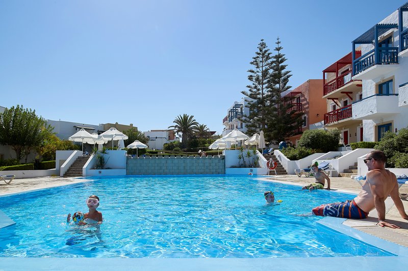 Ubicación - Este encantador hotel de playa está situado junto a una extensa playa de arena y piedras, en una de la zonas más bonitas de Creta.. Instalaciones - Los huéspedes podrán alojarse en una de las 322 habitaciones. Los huéspedes son recibidos en el vestíbulo, donde se ofrecen servicios de registro y salida. Las instalaciones incluyen una consigna para equipaje y una oficina de cambio. En cuanto a opciones gastronómicas, el resort cuenta con un restaurante, un bar y un bar de playa. Hay comercios. Los niños lo pasarán en grande en el parque infantil. Las instalaciones del complejo turístico incluyen una sala de juegos. La oferta disponible incluye un servicio de canguro, un servicio de alquiler de coches y una lavandería. Se ofrece servicio de traslado gratis. Los huéspedes más activos, con ganas de descubrir los alrededores en bicicleta, sabrán apreciar el servicio de alquiler de bicicletas.. Habitaciones - En las habitaciones hay aire acondicionado y un cuarto de baño. Los huéspedes del complejo de vacaciones reciben un obsequio de bienvenida. Para mayor relajación el equipamiento estándar de la mayoría de las habitaciones incluye un balcón o una terraza. La vista lateral al mar es uno de los encantos de algunos alojamientos. Si el huésped lo desea, puede solicitar camas supletorias o cunas. Además, hay una caja fuerte. El equipamiento estándar incluye una nevera. Para que el huésped disfrute de un confort óptimo, se ofrecen un teléfono, un televisor y Wi-Fi (gratis). Los cuartos de baño disponen de una bañera. Hay a disposición un secador de pelo y un espejo cosmético para el uso diario. Hay habitaciones familiares especiales para familias con niños.. Deporte y ocio - El alojamiento ofrece una piscina al aire libre y una piscina infantil. En el tobogán de agua se divertirán tanto jóvenes como adultos. Las tumbonas y sombrillas en la terraza invitan a relajarse. La bañera de hidromasaje en la zona de baño promete una relajación total. También hay un bar de piscina. La variedad deportiva en el resort incluye, por ejemplo, tenis, vóley-playa y minigolf y, por un cargo extra, golf y equitación. Se ofrece golf y equitación a través de terceros. La amplia oferta deportiva incluye deportes acuáticos como hidropedal, piragua y aeróbic acuático y, por un cargo extra, submarinismo. El complejo turístico ofrece numerosas opciones para practicar deportes en la zona interior, como un gimnasio, ping-pong, dardos, yoga y aeróbic, así como, por un cargo extra, billar. Hay una zona de bienestar con un spa y tratamientos de talasoterapia disponible en el complejo de vacaciones. La oferta de ocio incluye música en vivo, un club infantil y una discoteca infantil. Comidas - Se sirven bebidas sin alcohol y bebidas alcohólicas.. Tarjetas de crédito - En el alojamiento se aceptan las siguientes tarjetas de crédito: American Express, Visa, Diners Club y MasterCard..