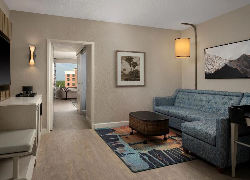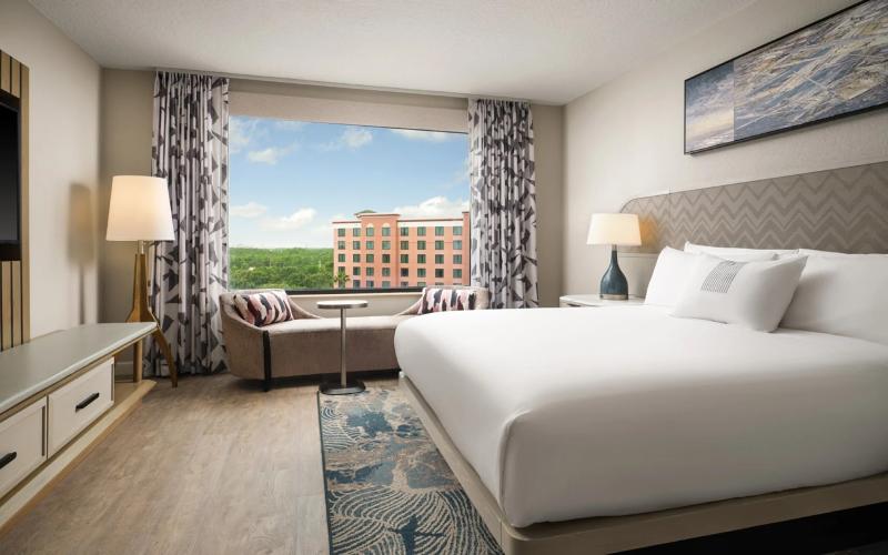 Tras una transformación de $140 millones, Caribe Royale Orlando presenta una experiencia vacacional completamente renovada, que incluye una imagen contemporánea, un estilo refinado y un servicio cálido e intuitivo de primer nivel: “The Royale Treatment”. Este resort de suites, galardonado con Cuatro Diamantes por la AAA, se encuentra a 2. 4 km de Walt Disney Resort. Todas las suites de un dormitorio han sido rediseñadas con un estilo fresco y contemporáneo, y ofrecen una gran variedad de servicios y comodidades. El exclusivo Villas at Caribe Royale, un hotel dentro del hotel, ofrece espaciosas suites de dos dormitorios con cocina completa, sala de estar y comedor, terraza acristalada y lavandería. Desde inspiradores menús personalizados hasta cenas al aire libre junto a la piscina, Caribe Royale Orlando ofrece ocho opciones gastronómicas para todos los gustos, incluyendo el renombrado Venetian Chop House, galardonado con Cuatro Diamantes por la AAA, un amplio Starbucks®, un nuevo y vibrante bar llamado Rum Bar, y la última incorporación, Stadium Club. Stadium Club es un bar deportivo interactivo con una experiencia de entretenimiento envolvente, que incluye 8 simuladores deportivos profesionales, visualización de juegos en 360 grados y comida de primera categoría. Abundan las oportunidades de recreación. Ya sea una tarde relajante en una de las cabañas privadas alrededor de la piscina con cascada y tobogán, mantener tu rutina de ejercicios en nuestro gimnasio, un partido de pickleball o pádel en las canchas deportivas, un tratamiento rejuvenecedor en Island Spa o una carrera en la pista de 2. 4 km. Para los más pequeños, la piscina infantil y el parque son los favoritos. Y, como hotel Disney Good Neighbor®, disfruta del transporte programado a los cuatro parques temáticos de Disney y Disney Springs®.