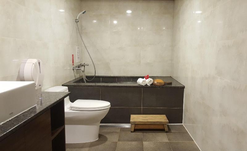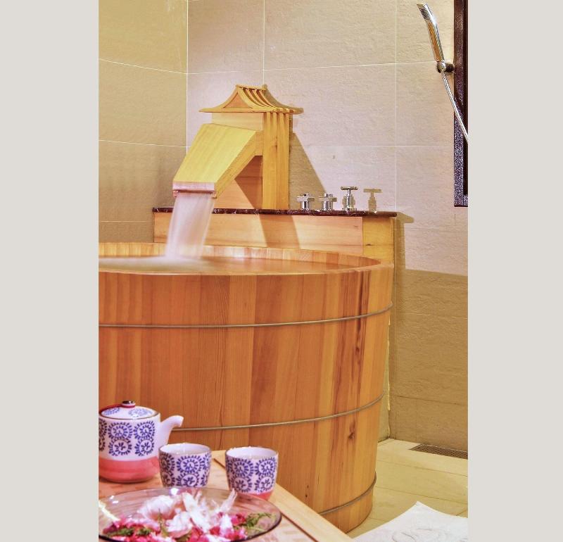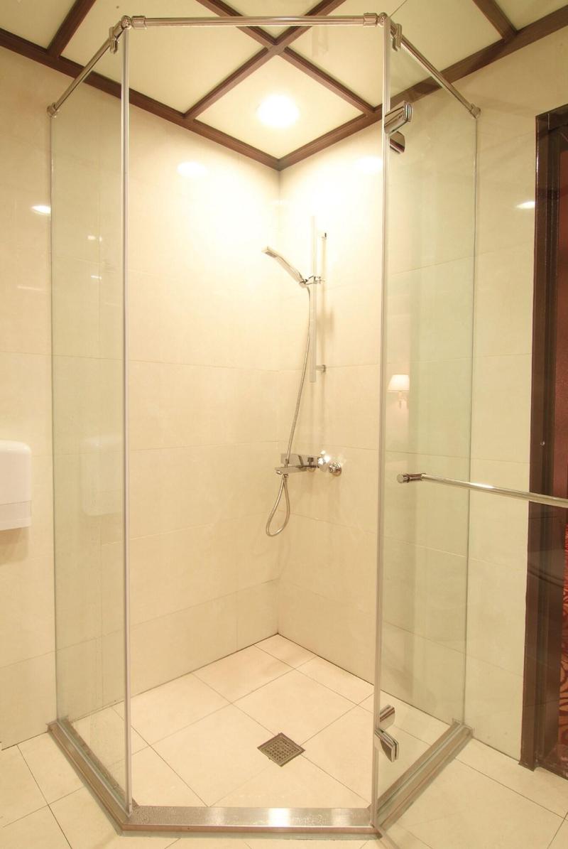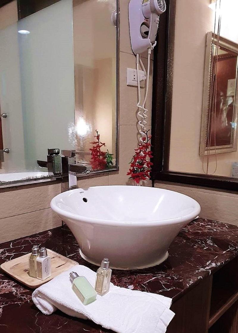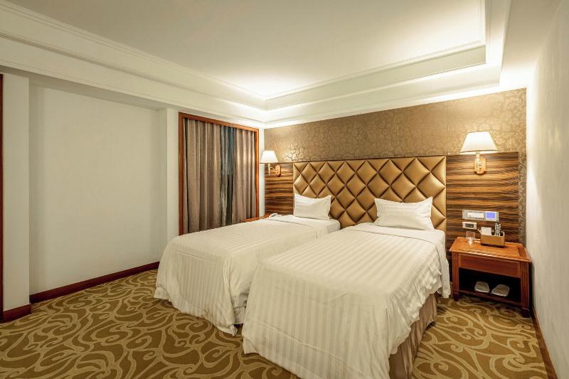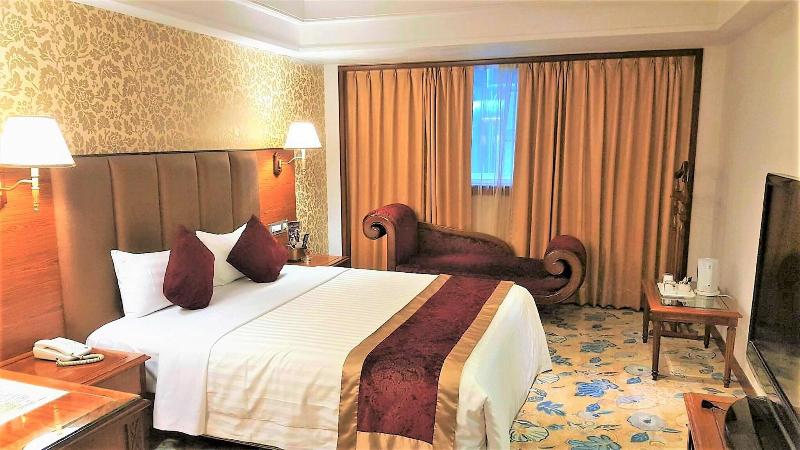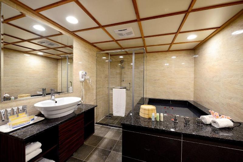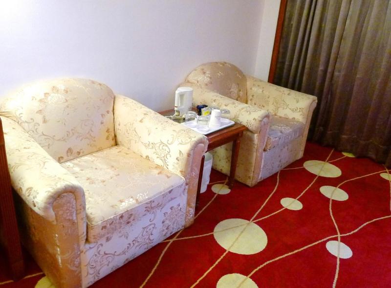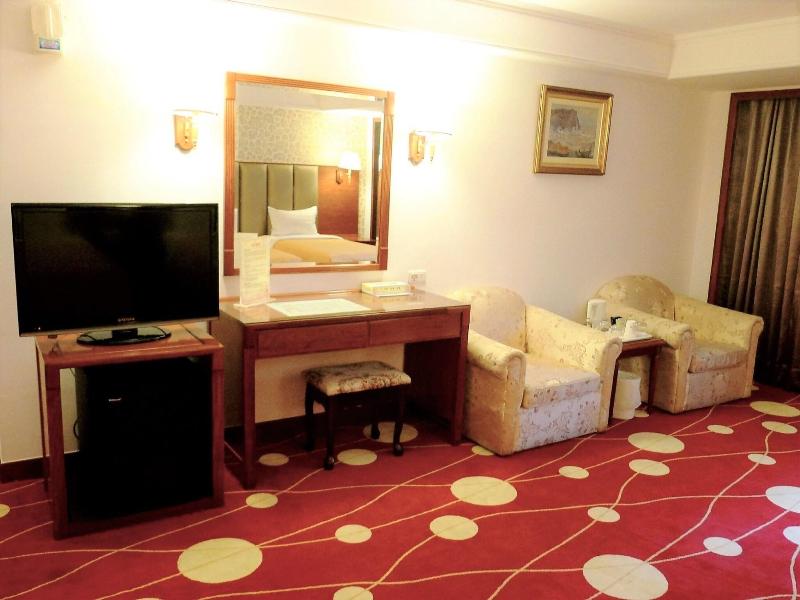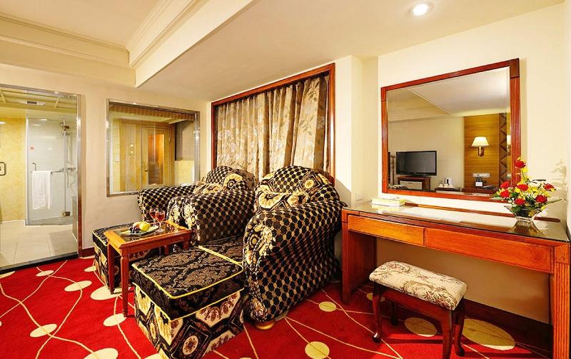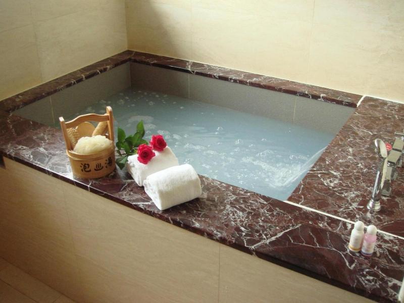 Glamouroso, espacioso, con grandes camas tamaño king pero un hotel antiguo. Proporcionar bañera de aguas termales y sauna en la habitación. Proporcione un desayuno v v simple n promedio.