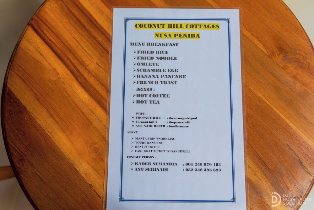Elige Coconut Hill Cottages en Isla Penida y estarás a poca distancia de Servicio de ferri Maruti Express Nusa Penida. Este bed and breakfast se encuentra a pocos kilómetros de Punta Mangrove y de Bahía de Gamat. Te sentirás como en tu propia casa en cualquiera de las 4 habitaciones con aire acondicionado y televisor LED. Mantén el contacto con los tuyos gracias a la conexión a Internet wifi gratis. El cuarto de baño está provisto de ducha y artículos de higiene personal gratuitos. Entre las comodidades, se incluyen escritorio y botella de agua gratuita, además de un servicio de limpieza disponible a petición. Con una terraza y jardín donde descansar y comodidades como conexión a Internet wifi gratis, ¡no te faltará de nada! Coconut Hill Cottages sirve deliciosas comidas en Ayu Nadi Resto. Se sirve un desayuno a la carta todos los días de 7:30 a 10:00 con un coste adicional. Tendrás check-in exprés, check-out exprés y servicio de tintorería a tu disposición. Hay un aparcamiento sin asistencia gratuito disponible.