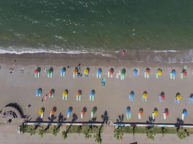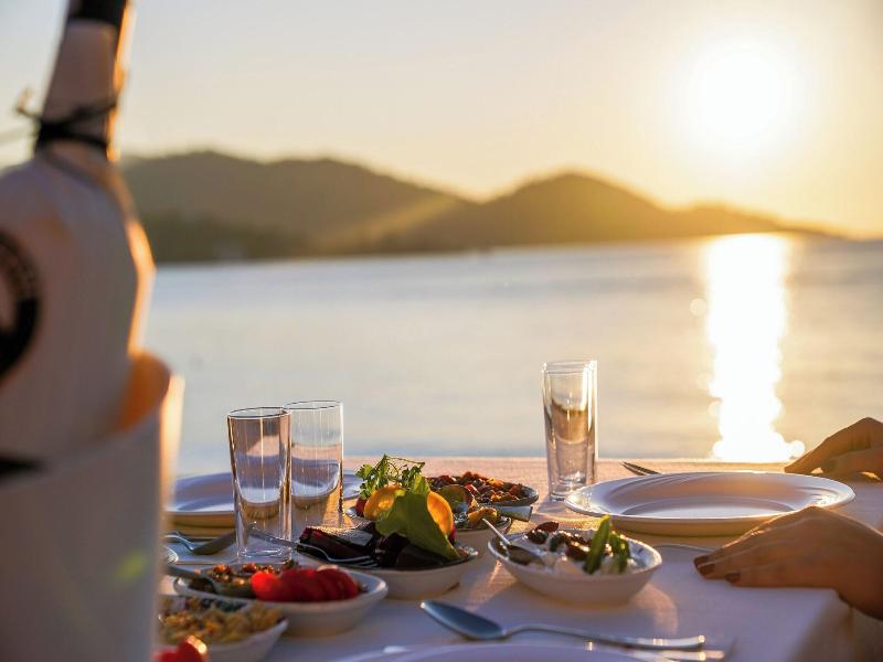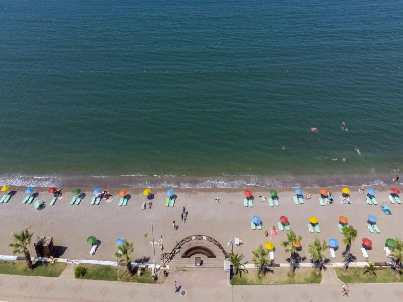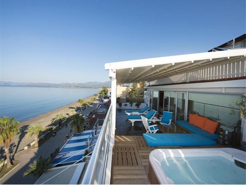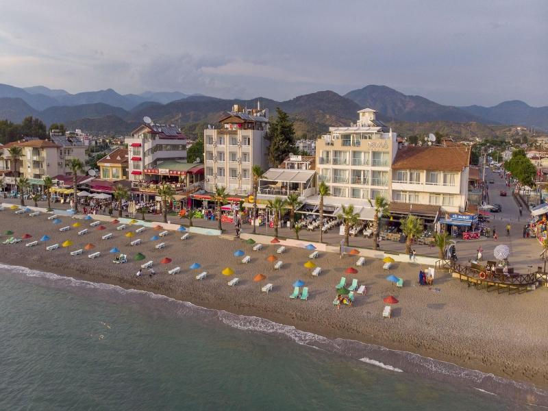 Está en la Playa de Çalis de Fethiye, un poco alejado del centro de la ciudad, pero bueno, tienes la playa debajo del hotel y un montón de tiendas y restaurantes.
