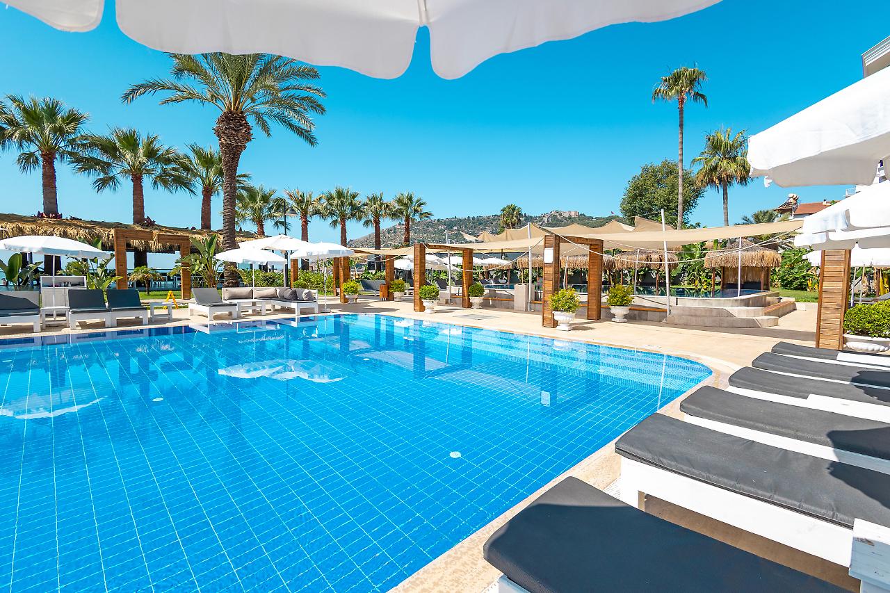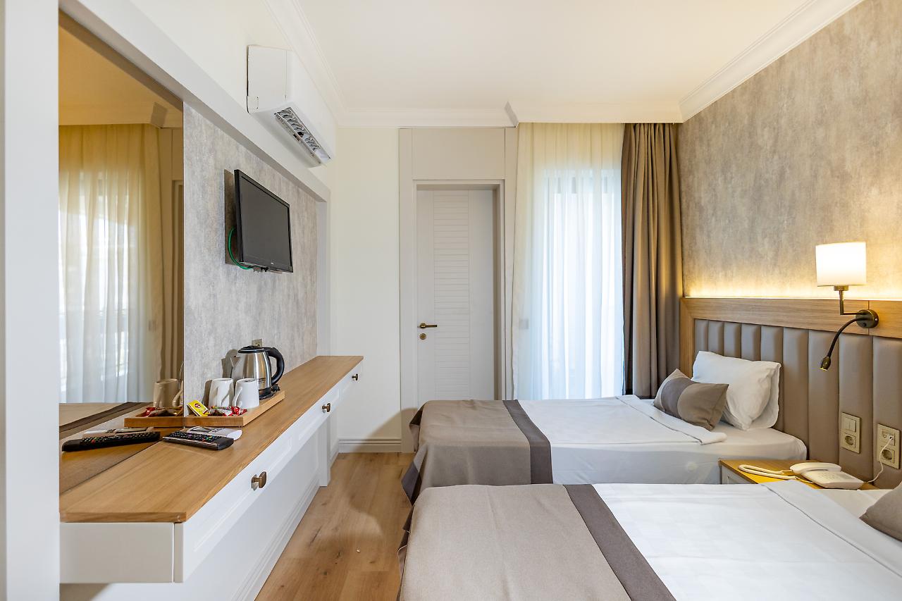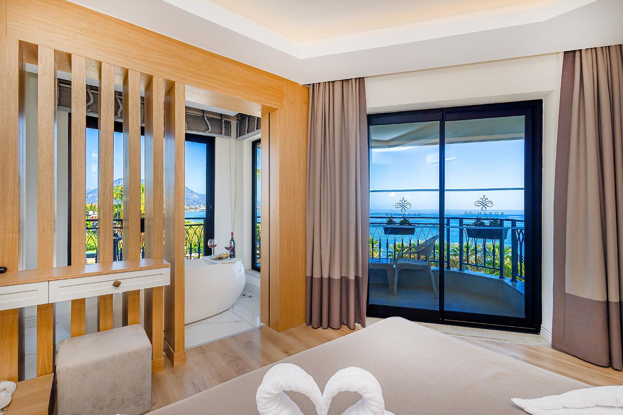 A unos 50 m de la playa privada y pública de arena, grava y piedra está el alojamiento De'Manor Hotel. Las tiendas y comercios están aprox. a 300 m del hotel, a unos 200 m puede encontrarse un supermercado. La distancia hasta el aeropuerto es de unos A unos 50 m de la playa privada y pública de arena, grava y piedra está el alojamiento De'Manor Hotel. Las tiendas y comercios están aprox. a 300 m del hotel, a unos 200 m puede encontrarse un supermercado. La distancia hasta el aeropuerto es de unos 40,4 km. Entre el hotel y el aeropuerto opera un servicio de traslado (de pago) durante 24 horas al día. Como opciones de entretenimiento, hay en las inmediaciones un teatro (a unos 2 km) y un cine (a unos 4 km). La playa es supervisada por un socorrista y galardonada con bandera azul. Los animales de compañía están permitidos en la playa. Aquí hay disponibles toallas de baño de pago y hamacas, colchonetas y sombrillas. Puede obtener bebidas frías directamente en el bar de la playa. Aquí hay también un paseo marítimo invita a dar un agradable paseo. El hotel con aire acondicionado y verificado por GPS cuenta con una recepción abierta las 24 horas del día (posibilidad de registrarse las 24 horas del día), un vestíbulo, conexión WiFi, conexión a Internet, un ascensor, un botiquín, aparcamiento (plazas limitadas) así como una sala de televisión con SAT-TV. En la parte exterior del establecimiento hay una piscina de temporada, en la cual puede disponerse de toallas de baño de pago y hamacas gratuito. Para su seguridad, el área de la piscina está supervisada por un salvavidas. Puede guardar sus objetos de valor en la caja fuerte y su equipaje en la consigna del hotel. Además, el hotel videovigilado las 24 horas. Pueden proporcionarse para los más pequeños cunas. Para su ropa, hay a su disposición un servicio de lavandería (de pago) y de planchado. Equipo de planchado también puede ser alquilado en el hotel por una tarifa. En caso de necesidad puede dirigirse al servicio médico todo el día. El voltaje del hotel es de 220 voltios. Para quienes disfrutan de su viaje de novios, el hotel tiene preparadas algunas ofertas especiales como, por ejemplo, una habitación decorada de forma romántica, habitaciones/artículos personalizados, habitaciones con una ubicación especialmente romántica y vistas, paquetes especiales de luna de miel, platos románticos en el restaurante, champán, vino espumoso, un regalo, una cesta de frutas o flores sobre la cama. En su hotel de vacaciones se da mucho valor a la sostenibilidad. A este propósito responden, entre otros, la separación de residuos en las habitaciones, un contenedor de reciclaje propio del hotel, la provisión de expendedores de jabón y champú y un sistema de limpieza compatible con el medio ambiente. El agua pueden dar lugar a costes adicionales en el hotel. Se aceptan Euro/Master Card o Visa como método de pago. Comidas Como servicios de restauración, el hotel ofrece: solo desayuno. Por la mañana se sirve un desayuno de bufé. Para el almuerzo se sirven platos de menú o a la carta con entrantes así como ensaladas (extras bajo petición y por un suplemento). Para la cena se sirven platos a la carta con entrantes y ensaladas. Todo incluido light incluye café y té, cerveza, vino así como bebidas alcohólicas locales e internacionales. Al reservar el todo incluido una bebida de bienvenida y - por un cargo adicional - algunas comidas en el restaurante a la carta se incluyen. Del disfrute culinario se ocupan un restaurante de bufé con terraza (comidas bajas en calorías y también vegetarianas) y una cafetería así como un bar de la piscina. La carta de bebidas del hotel incluye agua, refrescos, café y té, cerveza y vino. Distancias Parada de buses: A unos 50 m Parada de taxis: A unos 100 m Próximo médico: A unos 10 m Próximo dentista: A unos 1,2 km Próxima farmacia: A unos 25 m Hospital más cercano: A unos 900 m Próxima estación de diálisis: A unos 1,7 km Banco más cercano: A unos 550 m Información turística más