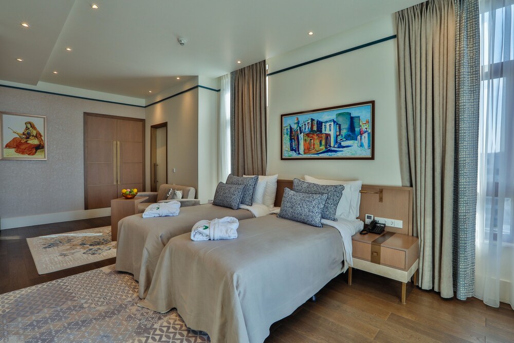 Las instalaciones y servicios incluyen recepción las 24 horas, aire acondicionado, Wi-Fi, aparcamiento, gimnasio, instalaciones para conferencias/banquetes, restaurante, club infantil, instalaciones de conserjería, cajero automático/cajero automático, personal multilingüe, transporte al aeropuerto (cargo extra), instalaciones de spa (cargo extra) y ascensor.La habitación cuenta con aire acondicionado, Wi-Fi, escritorio, caja de seguridad, televisión por cable/satélite, nevera, cafetera/tetera, servicio a la habitación, secadora de pelo, ducha y teléfono.Dirección: Carretera Zigh 22 km. Bakú AZ1000 Bakú Azerbaiyán
