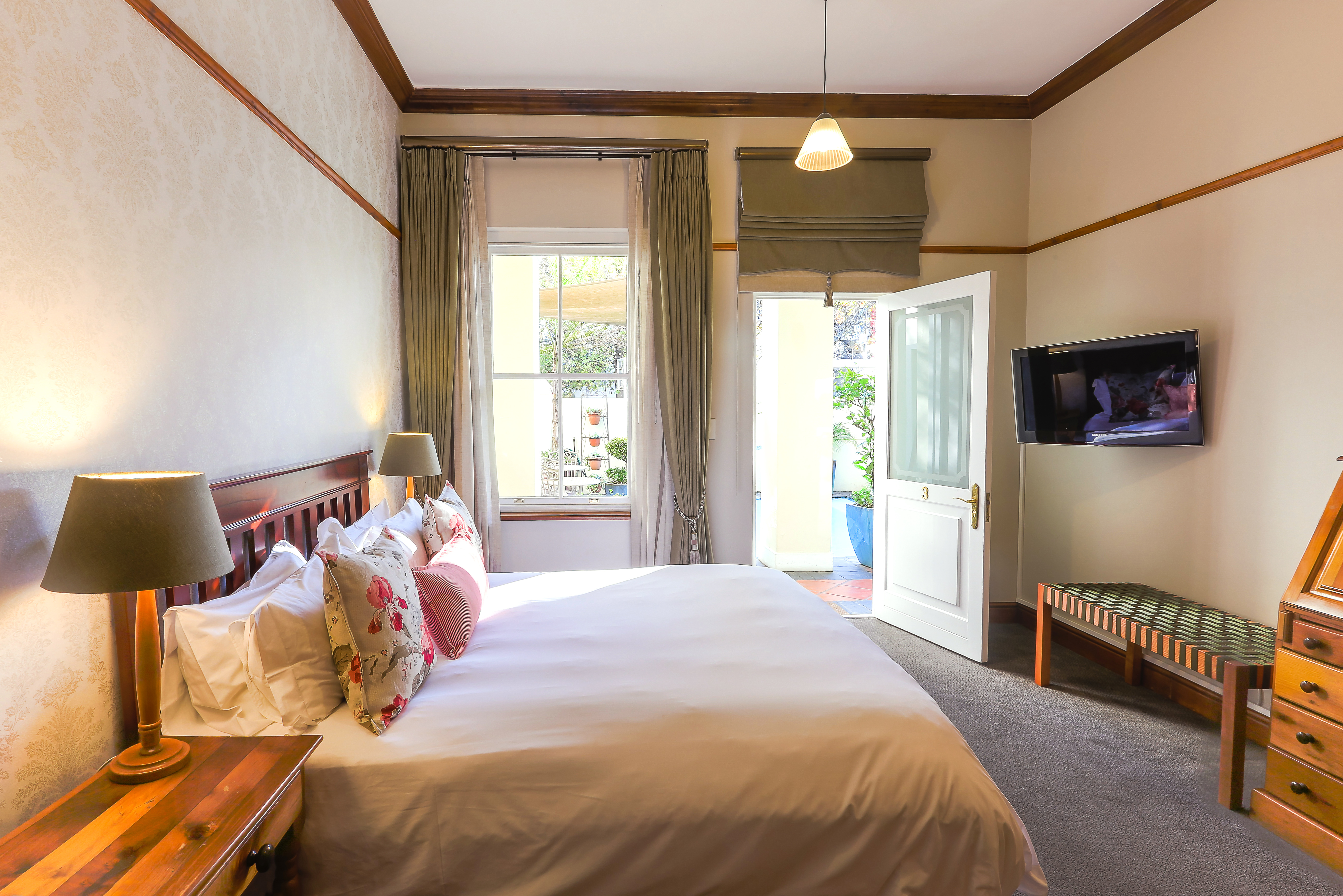 Las instalaciones y servicios incluyen sala de desayunos, cafetería, terraza, piscina, acceso a Internet inalámbrico y sala de reuniones.Las habitaciones cuentan con teléfono, televisión, caja de seguridad, aire acondicionado, acceso a Internet inalámbrico, cafetera, nevera, balcón / terraza y cuarto de baño.Las Junior Suites también disponen de reproductor de DVD.** Nota: Recepción con horario limitado. Se ruega que indique el número de vuelo y hora estimada de llegada al hacer la reserva del hotel.**Dirección: 161 Dorp Street, Stellenbosch 7600, W. Cape-Cape Town-Garden Route, Sudáfrica.