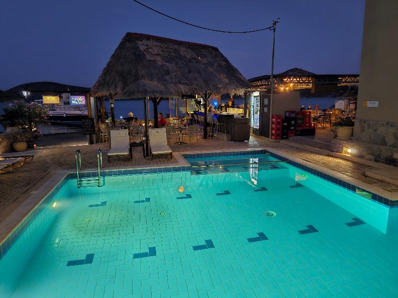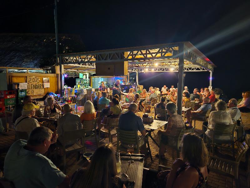 En realidad no nos quedamos aquí, sino en uno de nuestros primeros días en Elounda, fuimos a tomar algo en el bar de la Selva, que es parte de los apartamentos, disfrutamos de las personas, las...