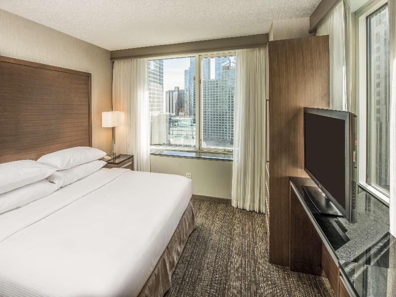Los siguientes servicios y comodidades están disponibles, pero con **servicio reducido**: Gimnasio, Desayuno. Los siguientes servicios y comodidades **no están disponibles actualmente**: Recepción social vespertina de cortesía, Conserjería, Restaurante(s) en el hotel, Piscina, Servicio a la habitación, Servicio de estacionamiento. El Embassy Suites Chicago Downtown Magnificent Mile es un hotel elegante y exclusivo de 4 diamantes ubicado en el centro de Chicago, a pocos minutos de las tiendas de Michigan Avenue y la diversión familiar del Navy Pier. La zona de Magnificent Mile también alberga restaurantes y opciones de entretenimiento de primer nivel, así como numerosas empresas. El Northwestern Memorial Hospital y el Gleacher Center de la Universidad de Chicago se encuentran a poca distancia a pie. Hay un supermercado Whole Foods al cruzar la calle, y un Target y un Walgreens a la vuelta de la esquina para su comodidad. El hotel está ubicado en un punto céntrico con respecto a los aeropuertos Chicago O'Hare (ORD) y Midway (MWI), a los cuales se puede acceder fácilmente mediante el transporte público que rodea el hotel. El Embassy Suites Magnificent Mile cuenta con 455 amplias suites de dos habitaciones, cada una con dormitorio privado y sala de estar independiente, dos televisores de 48 pulgadas y una cocina pequeña con refrigerador, microondas y cafetera. Mejore su habitación para disfrutar de vistas aún más espectaculares del centro de Chicago, así como servicios adicionales. Todas las suites incluyen desayuno a la carta gratuito y una recepción vespertina de cortesía*, que se sirven a diario en nuestro pintoresco atrio de cristal y en el Sky Garden, nuestro jardín de hierbas en la azotea. Disfrute de un plato con hierbas aromáticas o de un cóctel especial de Herradura en el 511 North. Comience el día ejercitándose en el gimnasio abierto las 24 horas con equipamiento moderno, o con un chapuzón en nuestra piscina cubierta.