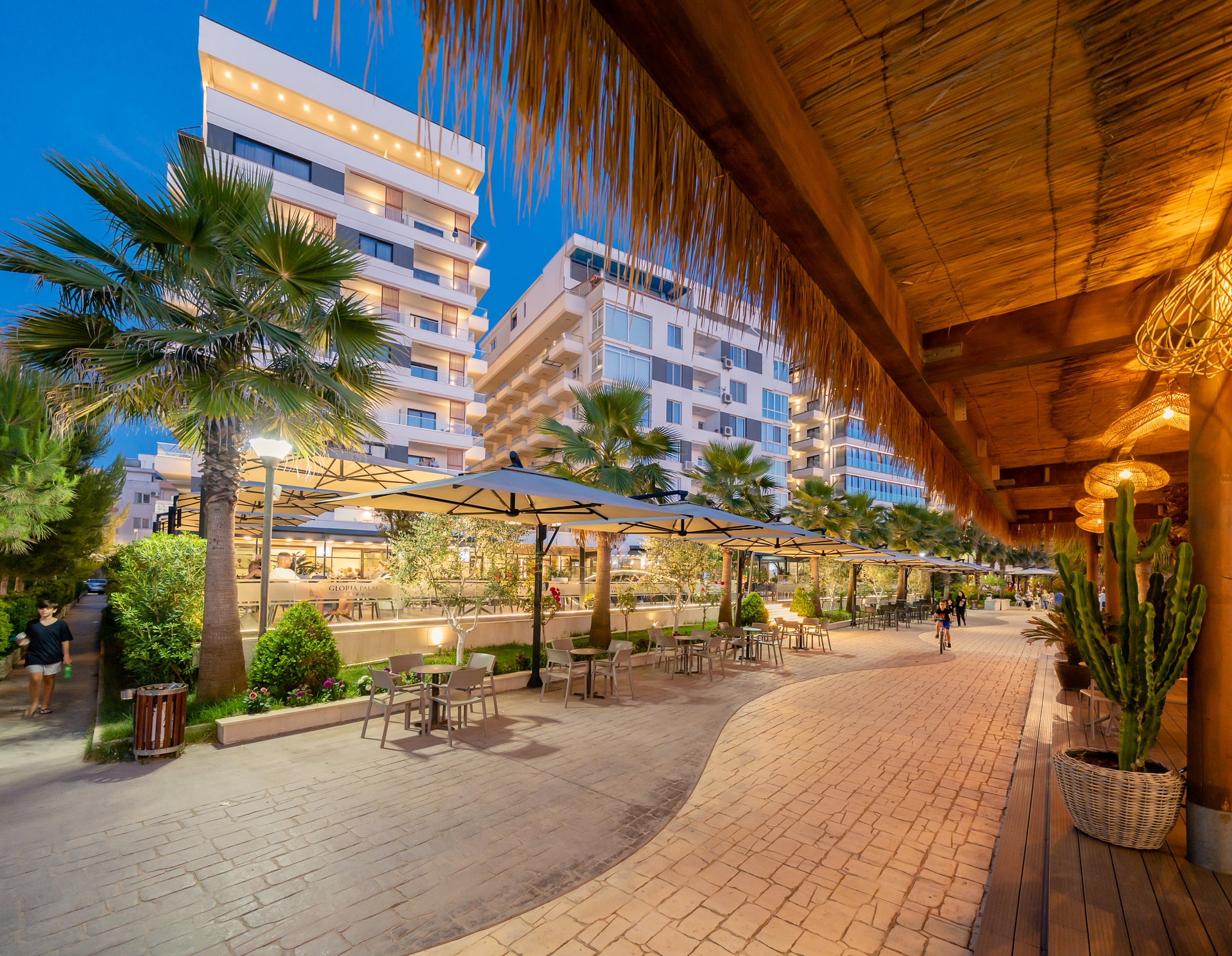 Unos 50 m de la playa privada y pública de arena está el hotel Gloria Palace Hotel & SPA. La distancia hasta el aeropuerto es de unos 44 km. La playa es supervisada por un socorrista y galardonada con bandera azul. Aquí hay disponibles colchonetas, sombrillas y toallas de baño. Puede obtener bebidas frías directamente en el bar de la playa. Este hotel halal con aire acondicionado y verificado por GPS está equipado con una recepción abierta las 24 horas del día (posibilidad de registrarse las 24 horas del día), un bar del lobby, conexión WiFi, conexión a Internet, 2 ascensores, un botiquín, aparcamiento y una sala de televisión con SAT-TV. También puede encontrarse en el hotel una peluquería. En la parte exterior hay una piscina (abierto todo el año), en la cual puede disponerse de hamacas, sombrillas y toallas de baño gratuito. Aquí hay también una piscina para niños con área para no nadadores. Para su seguridad, el área de la piscina está supervisada por un salvavidas. Los huéspedes del hotel pueden utilizar dentro del establecimiento una piscina cubierta. También existe un cajero automático en el área del hotel. Puede guardar sus objetos de valor en la caja fuerte y su equipaje en la consigna del hotel. Además, el hotel videovigilado las 24 horas. Pueden proporcionarse para los más pequeños cunas. Para su ropa, hay a su disposición un servicio de lavandería (de pago) y de planchado. Equipo de planchado también puede ser alquilado en el hotel por una tarifa. El voltaje del hotel es de 240 voltios. Si desea explorar la región de sus vacaciones, puede utilizar el servicio de alquiler de coches próximo al hotel. Para quienes disfrutan de su viaje de novios, el hotel tiene preparadas algunas ofertas especiales como, por ejemplo, una habitación decorada de forma romántica, habitaciones con una ubicación especialmente romántica y vistas, platos románticos en el restaurante, champán, vino espumoso, un regalo, una cesta de frutas o flores sobre la cama. En su hotel de vacaciones se da mucho valor a la sostenibilidad. A este propósito responden, entre otros, un contenedor de reciclaje propio del hotel, la provisión de expendedores de jabón y champú, comida ecológica y alimentos orgánicos, un sistema de ventilación centralizado de la habitación y un sistema de limpieza compatible con el medio ambiente. Se aceptan Euro/Master Card o Visa como método de pago. Comidas Como servicios de restauración, el hotel ofrece: todo incluido, media pensión y solo desayuno. Por la mañana se sirve un desayuno americano y continental (extras bajo petición y por un suplemento). Para el almuerzo se sirven platos de menú, de bufé o a la carta con entrantes, ensaladas así como postres (extras bajo petición y por un suplemento). Para la cena se sirven platos de menú o a la carta con entrantes, ensaladas y postres (extras bajo petición y por un suplemento). La media pensión incluye desayuno y cena. Todo incluido light incluye café y té, pasteles y bollería así como bebidas alcohólicas internacionales. Al reservar el todo incluido - por un cargo adicional - algunas comidas en el restaurante a la carta se incluye. Además, el servicio todo incluido incluye agua (24h) así como bebidas alcohólicas internacionales (limitadas). Del disfrute culinario se ocupan un restaurante (comidas italiana, mediterránea, bajas en calorías y sin gluten) y varios bares. La carta de bebidas del hotel incluye agua, refrescos, café y té, cerveza y vino. Distancias