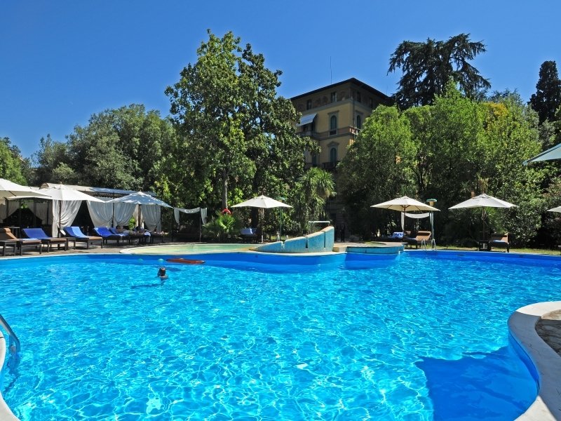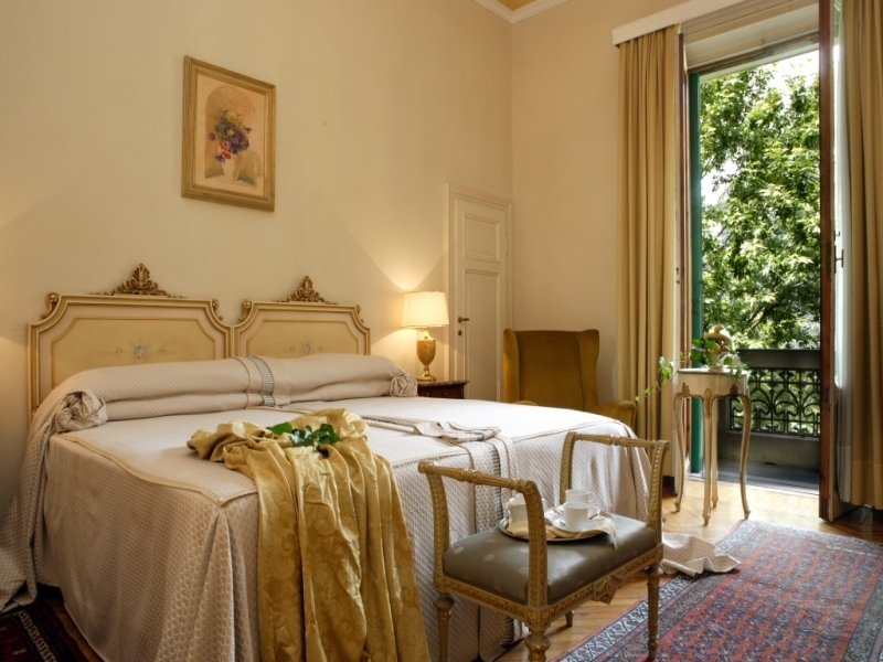 Este tradicional hotel est situado en un edificio histrico del ao 1870 y cuenta con 136 habitaciones, 14 de ellas suites, repartidas en cuatro plantas. Adems, esta elegante casa de estilo toscano est rodeada por una zona ajardinada de 216.000 m2. El hotel no se ha ganado su renombre tan slo por su edificio, sino que tambin por sus excelentes instalaciones. Este hotel se restaur por completo en el ao 2003 y ofrece a sus huspedes un hall de entrada con servicio las 24 horas, una caja fuerte y un ascensor. Asimismo, tiene a su disposicin varios salones, una cafetera de paredes estucadas, un bar con piano muy acogedor y dos restaurantes a la carta climatizados y con terraza. El servicio de habitaciones y de lavandera completa todas estas prestaciones. Adems, podr aparcar su vehculo en una plaza de aparcamiento del propio hotel.