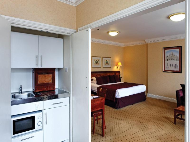 Hotel muy tranquilo con espaciosas habitaciones y amplio baño, algo inusual en Londres. La cama, king, comodisima; cuenta tambien con pequeño fregadero, microondas, nevera y cafetera disimulados como...