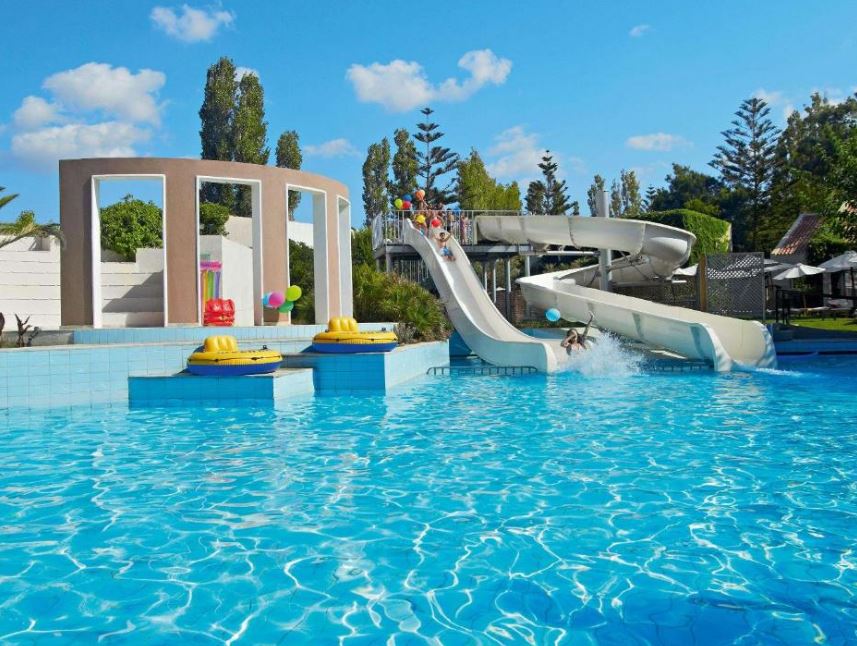El hotel alberga una impresionante zona de piscina con piscinas al aire libre, piscinas cubiertas y piscina infantil con toboganes de agua.