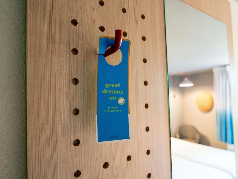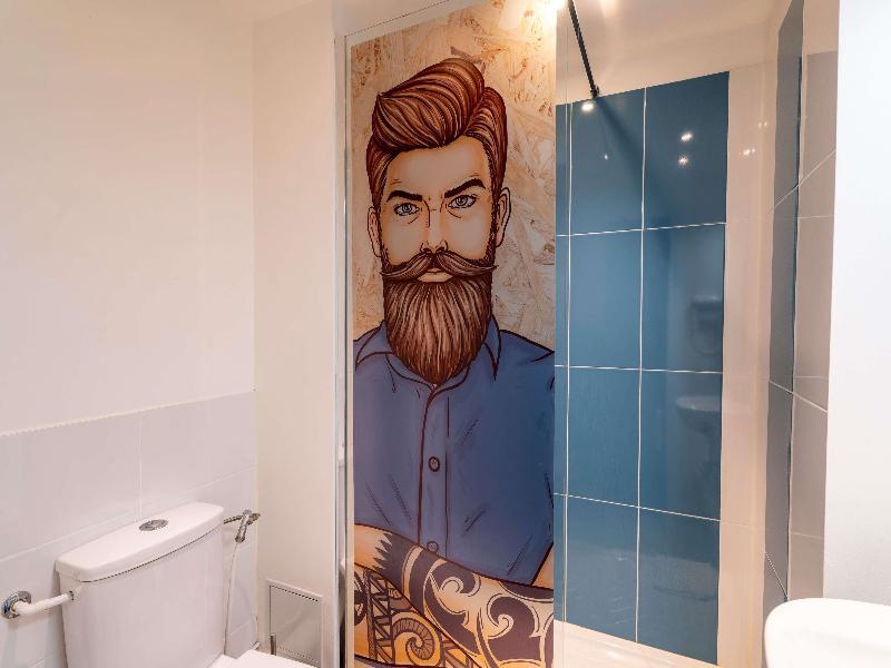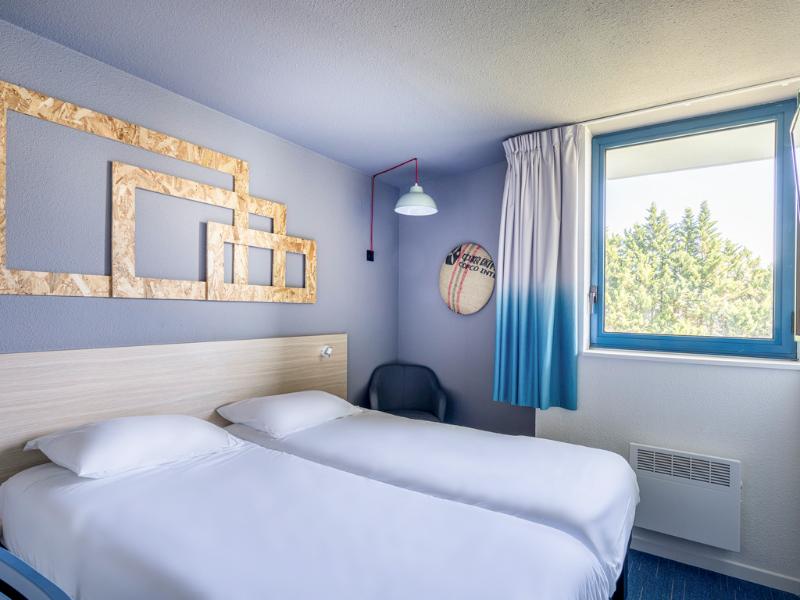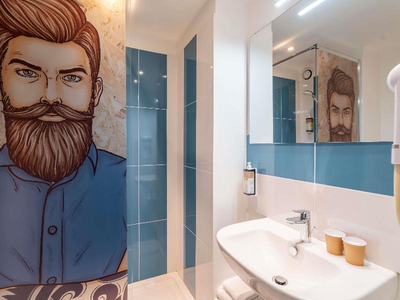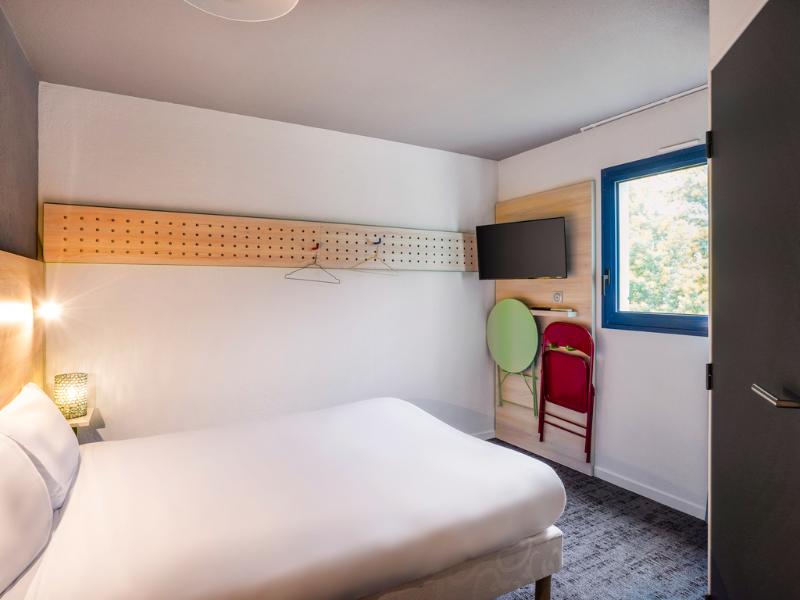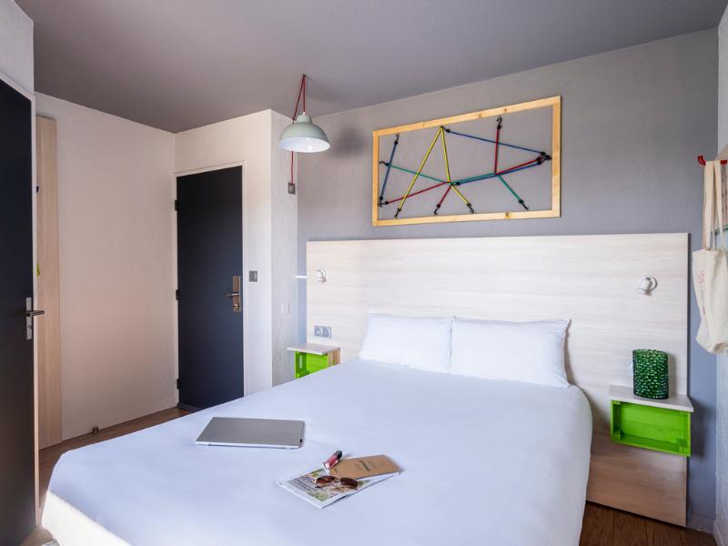 Hotel divertido con motivos de los 80. La habitación era pequeña, pero cómoda, y el personal de recepción era muy agradable. Cerca del aeropuerto de Burdeos y justo en la línea de tranvía, si no...