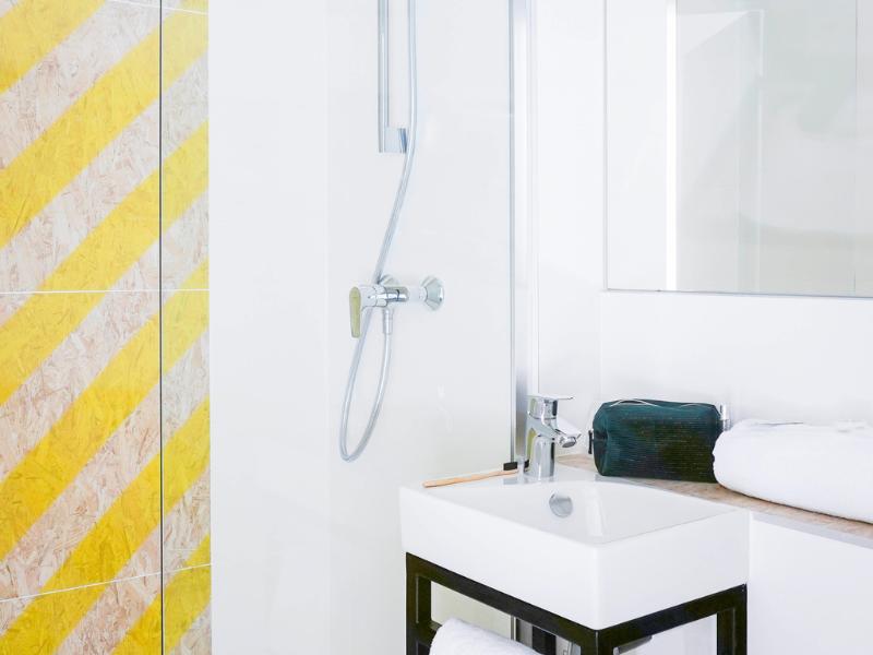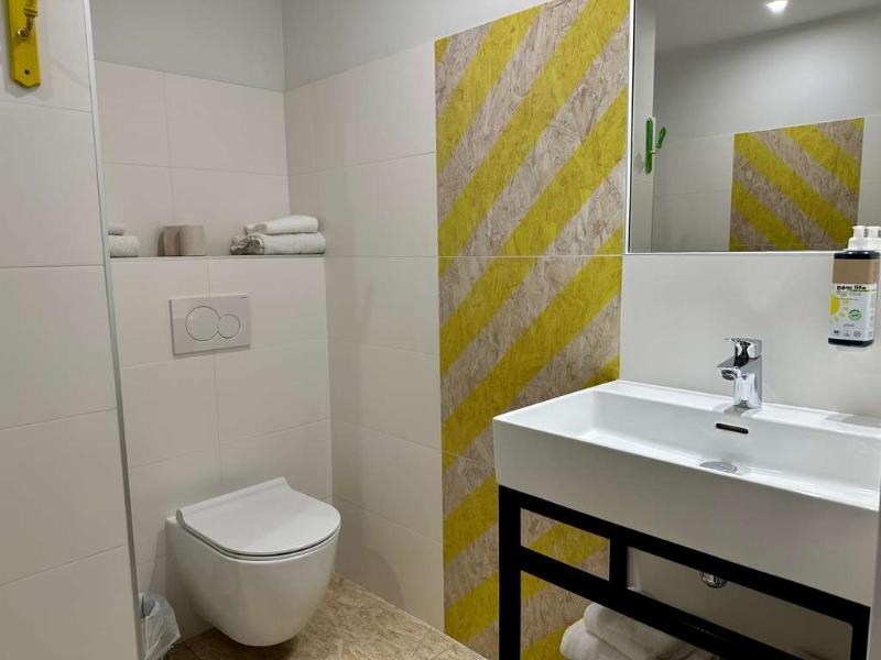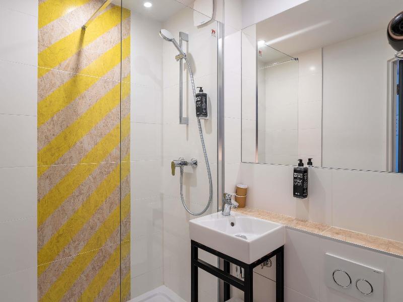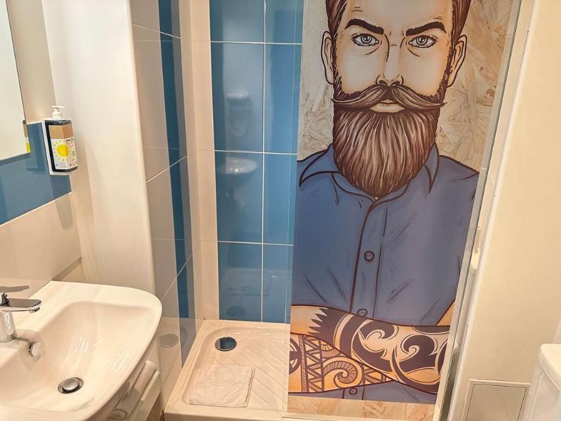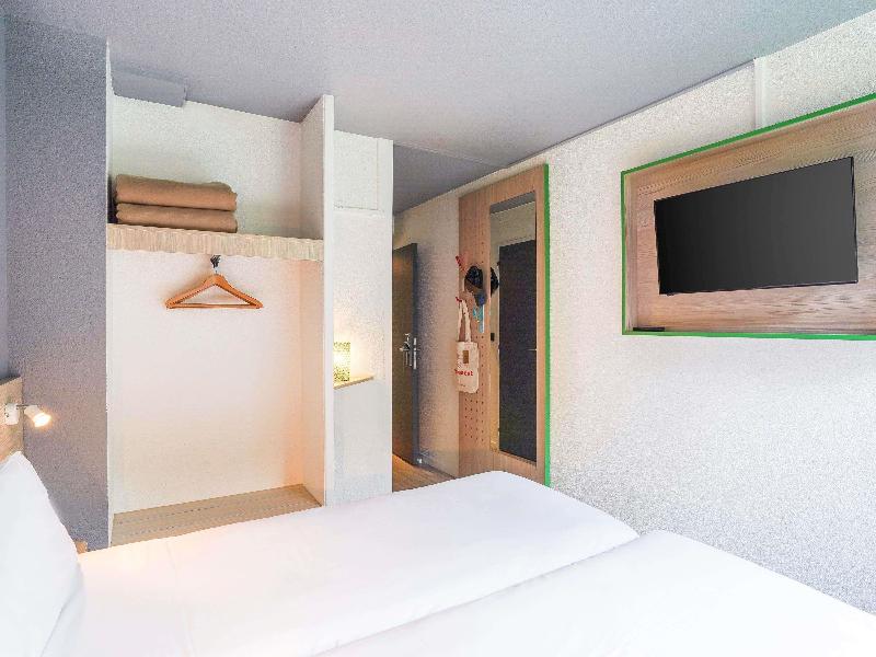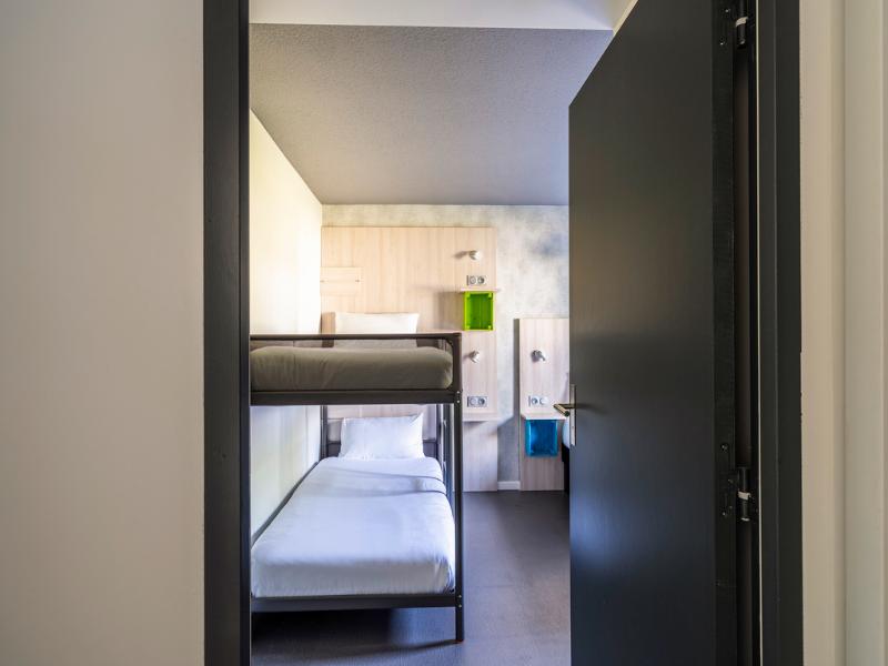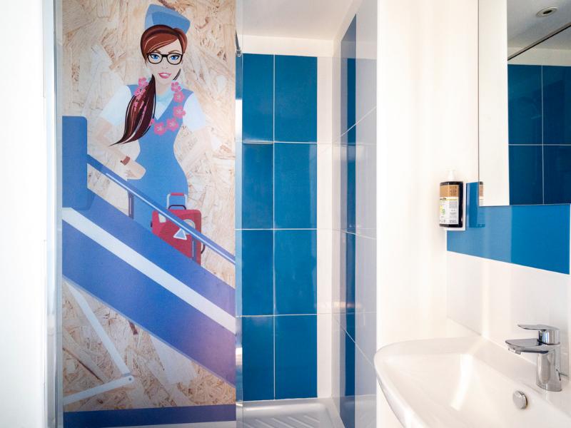 Hotel divertido con motivos de los 80. La habitación era pequeña, pero cómoda, y el personal de recepción era muy agradable. Cerca del aeropuerto de Burdeos y justo en la línea de tranvía, si no...
