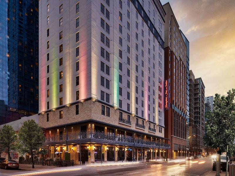 El Hampton Inn & Suites Austin Downtown, de 16 pisos, ofrece 209 habitaciones y suites a solo una cuadra del Austin Convention Center y los senderos para caminar y andar en bicicleta de Town Lake. Puedes disfrutar del servicio a la habitación de P. F. Chang's y Fleming's, o caminar a más de 75 restaurantes y clubes nocturnos cercanos. Comienza tu día con un desayuno caliente de cortesía, servido de 6:00 a 10:00 h. De lunes a jueves, de 17:00 a 18:30 h, se ofrece una recepción del gerente con cerveza, vino y refrigerios de cortesía. Las comodidades incluyen wifi, llamadas telefónicas locales, gimnasio, piscina al aire libre, lavandería y salas de reuniones, todo sin cargo. El servicio de estacionamiento con valet tiene un costo de $35. 00 USD por día.