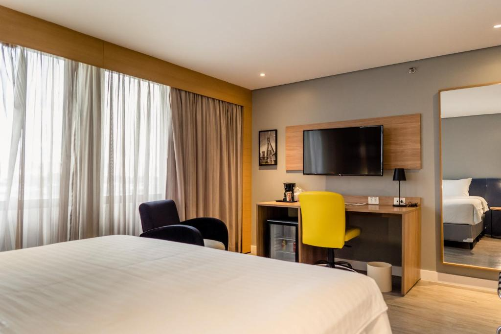 Ubicación - El hotel se encuentra justo detrás del centro de convenciones y exposiciones de Anhembi (el más grande de Latinoamérica). Se encuentra también cerca de la autopista principal de São Paulo, lo que proporciona un fácil acceso a toda la parte norte de la ciudad. El centro de congresos y exposiciones de Anhembi dispone de espacio para 18.000 personas y este hotel es el más cercano al mismo.. Instalaciones - Los huéspedes se alojan en 780 habitaciones. Las instalaciones incluyen un guardarropa, una consigna para equipaje, una caja fuerte y una oficina de cambio. En las zonas públicas hay Wi-Fi a disposición de los huéspedes. Hay diferentes instalaciones gastronómicas entre las que escoger, como un restaurante y un bar. Hay disponibles un supermercado y otras tiendas. Las instalaciones del hotel incluyen una sala de TV. Aquellos que viajen con vehículo propio pueden dejarlo en el aparcamiento del alojamiento. La oferta disponible incluye servicio de habitaciones y una lavandería.. Habitaciones - En las habitaciones hay aire acondicionado y un cuarto de baño. El equipamiento estándar de la mayoría de las habitaciones incluye un balcón. Para el descanso nocturno en las habitaciones hay una cama doble a disposición. Además, hay una caja fuerte y un minibar. Asimismo, hay disponibles una mini nevera y una cafetera/tetera. Hay un set de plancha para mayor comodidad de los huéspedes. Pequeños extras se encargan de proporcionar una estancia agradable, como conexión a Internet, teléfono, televisor y Wi-Fi. Los cuartos de baño disponen de una ducha. Las comodidades incluyen un secador de pelo. El establecimiento ofrece habitaciones de no fumadores y habitaciones para fumadores.. Deporte y ocio - Las actividades deportivas y de ocio completan la oferta del hotel. El alojamiento dispone de una piscina y una piscina cubierta. Las actividades de ocio ofrecidas proporcionan variedad; estas incluyen un gimnasio y una sauna. Comidas - Los huéspedes pueden escoger entre desayuno, almuerzo y cena..