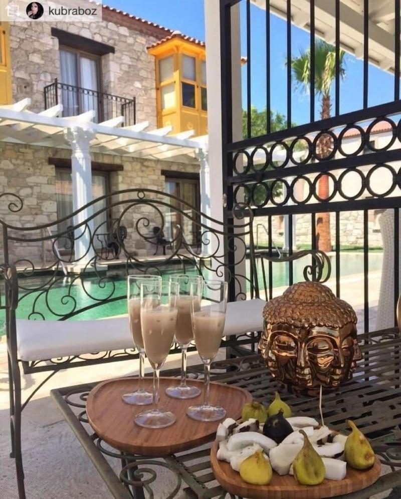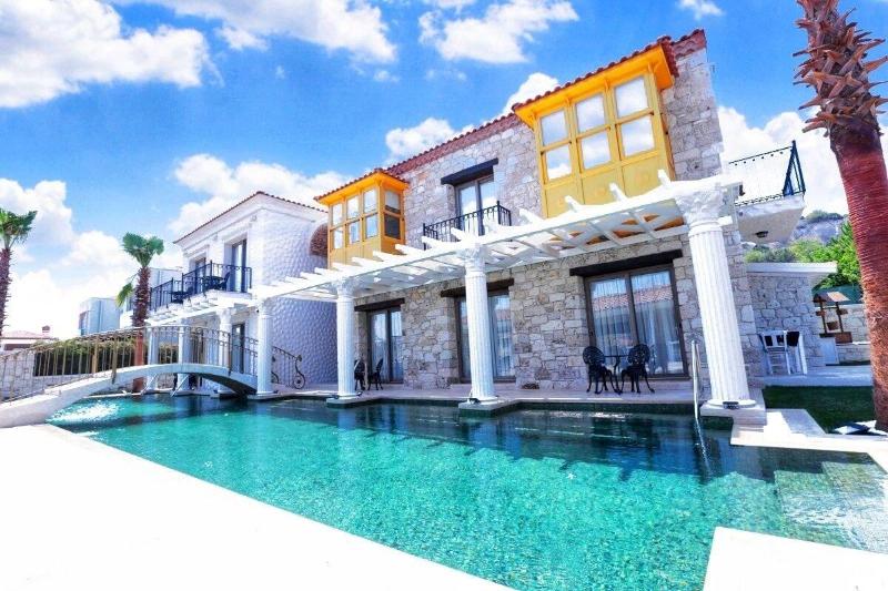 Deniz Kabugu Hotel, un edificio de piedra con ventanales tipo bay window, diseñado según e...