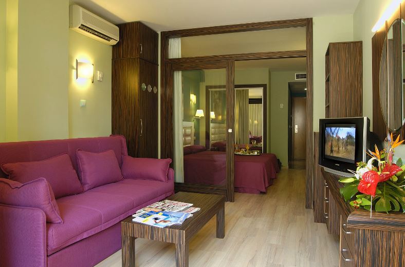 Este alojamiento está a 13 minutos a pie de la playa. El Evenia Olympic Palace Hotel forma parte del Evenia Olympic Resort, que cuenta con piscinas tropicales, parque acuático, jardines y programas de animación para todas las edades. Todas las habitaciones del Evenia Olympic Palace disponen de aire acondicionado, 2 TV vía satélite, zona de estar, balcón privado, nevera, caja fuerte y baño privado con secador de pelo y artículos de aseo. El Olympic Resort está rodeado de jardines y cuenta con restaurante, bar junto a la piscina, cafetería y discoteca. Para los niños hay un programa de animación muy completo, una zona de juegos y un miniclub. El Resort alberga un club deportivo con circuito de agua con piscina cubierta, sauna, hammam y bañera de hidromasaje. El centro de fitness del club deportivo ofrece sala de spinning, musculación y aeróbic.