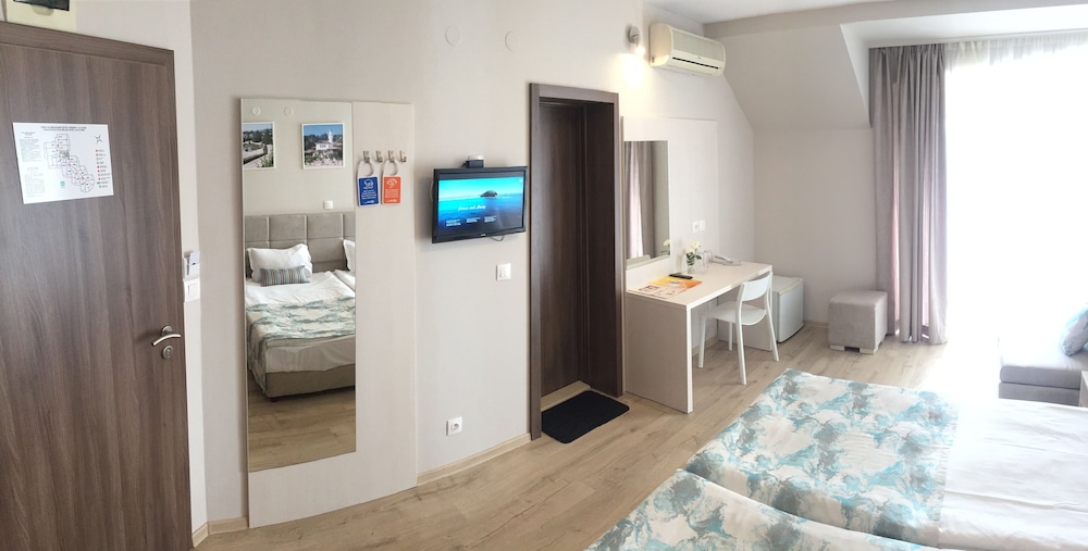 Si optas por alojarte en Hotel Helios de Balchik, estarás cerca de la playa y a apenas 10 min en coche de Playa de San Jorge. Además, este complejo turístico de playa se encuentra a 15,9 km de Estadio de Kavarna y a 16,5 km de Iglesia de San Jorge. Te sentirás como en tu propia casa en cualquiera de las 59 habitaciones con aire acondicionado, frigorífico y televisor LCD. La conexión a Internet wifi gratis te mantendrá en contacto con los tuyos; también podrás ver tu programa favorito en el televisor con canales por satélite. El cuarto de baño está provisto de ducha y secador de pelo. Entre las comodidades, se incluyen un servicio de limpieza disponible todos los días, además de la posibilidad de solicitar tabla de planchar con plancha. Recibe los cuidados que te mereces gracias al servicio de masajes o aprovecha instalaciones recreativas como piscina al aire libre y muchas más. Encontrarás también conexión a Internet wifi gratis y servicio de peluquería. Acércate a uno de los 2 restaurantes de este complejo turístico para comer algo, o aprovecha el servicio de habitaciones con horario limitado. ¿Quieres despejarte? Relájate y disfruta con la bebida que quieras en uno de los 2 bares con salón. Hay un aparcamiento sin asistencia gratuito disponible.