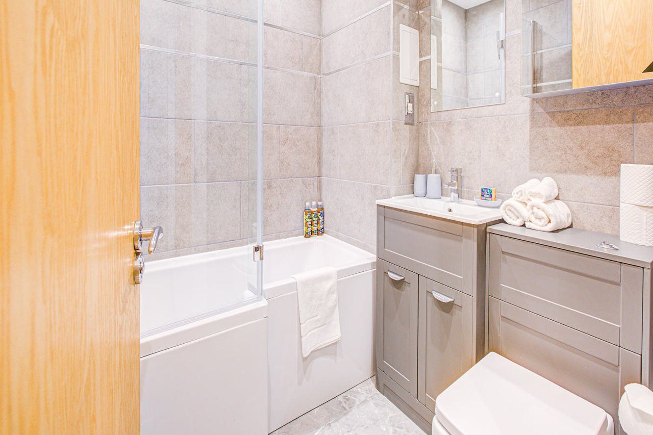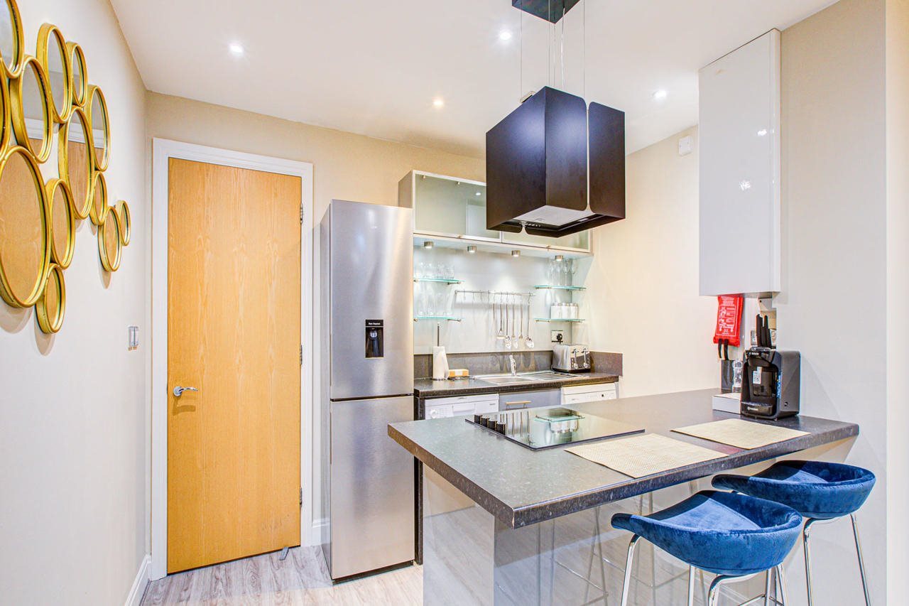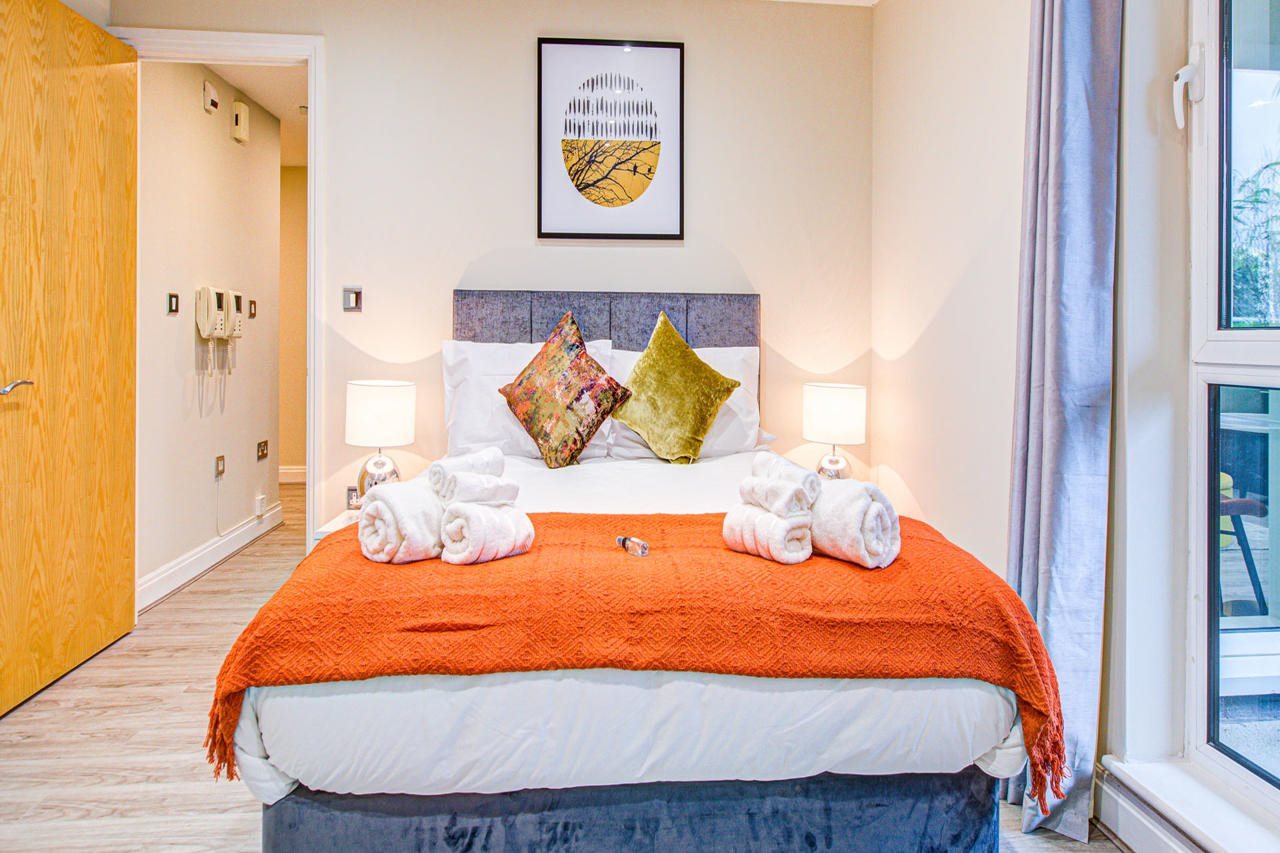 The three-bedroom on mezzanine floor apartment features a King size bed, Super king size bed and a double sofa-bed with two bathrooms, a Hybrid office desk and an executive chair along with LG split screen monitor, a modern living area with wooden flooring, a fully equipped kitchen with an oven, hob, microwave, fridge freezer and a communal garden. Apartment facilities include a dining area, Smart TV, and free internet access.