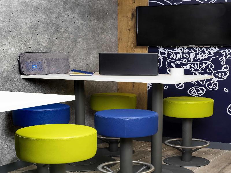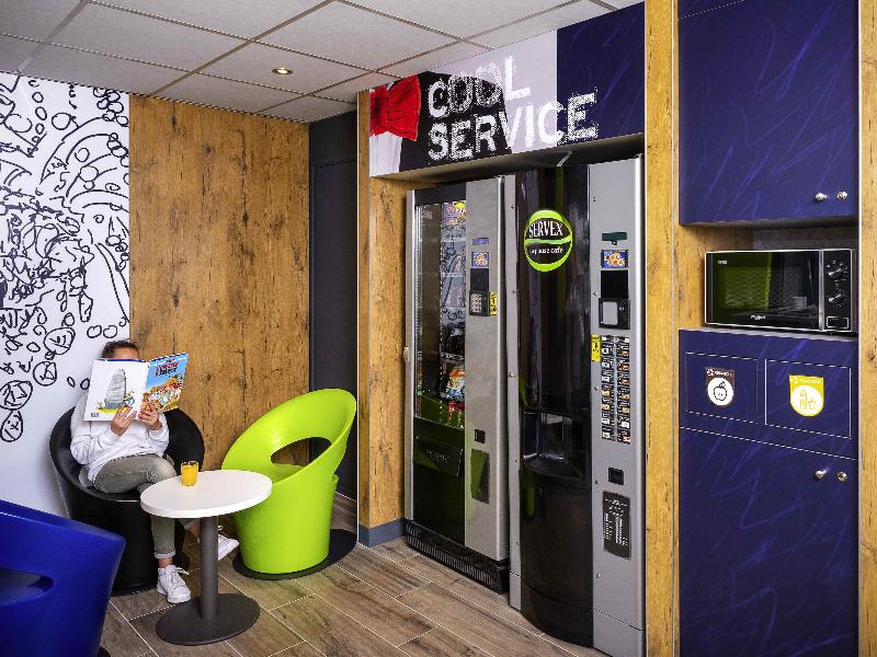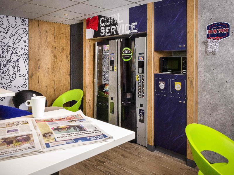 New addition to an existing ibis Styles on the same site. Separate building though, so you can't use the pool and breakfast is served separately for a fee. There is just one guy doing check-ins...