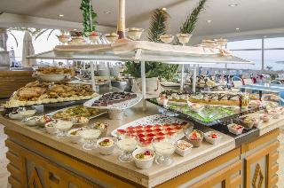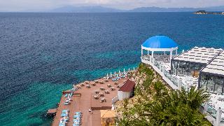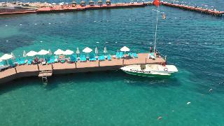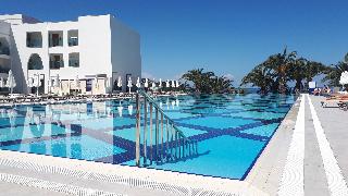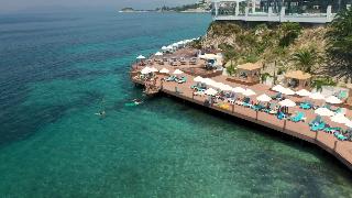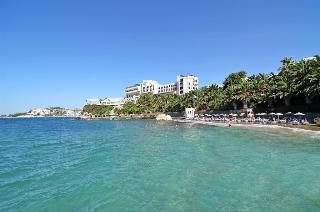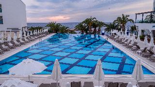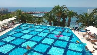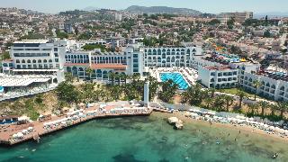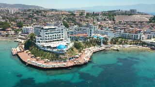 Este elegante hotel de playa esta situado en una cala, en una zona centrica de Kusadasi, enfrente de la playa privada del hotel, que es en parte rocosa. Esta a ocho kilometros de Kusadasi y desde enfrente del hotel hay linea regular de minibuses.Este hotel cuenta con 7 plantas y un total de 310 habitaciones, 286 de ellas dobles y 9 suites. Ofrece a sus huespedes variadas instalaciones, como un elegante hall de entrada con ascensores y area de recepcion abierta las 24 horas del dia y que le ofrece servicio de caja fuerte y de guardarropa. Se trata de unas amplias instalaciones hoteleras rodeadas de una preciosa zona ajardinada, con restaurantes, sala de estar, varios bares, cafeteria, pasteleria, peluqueria y tienda. Como prestaciones adicionales estan el servicio de habitaciones, de lavanderia y de atencion medica. Tambien estaran a su disposicion el aparcamiento, la terminal de Internet y el club infantil.Las acogedoras y confortables habitaciones disponen de bano con secador de pelo, telefono de linea directa, TV via satelite o por cable, equipo de musica, minibar, aire acondicionado, nevera, moqueta y balcon o terraza.El hotel dispone de una piscina con zona para ninos, tumbonas, sombrillas y bar, sauna, servicio de masajes (abonando tasas), pistas de tenis, mesas de ping-pong y de billar, gimnasio, un amplio programa de actividades que depende de la temporada. Tambien podra practicar los siguientes deportes o actividades: aerobic acuatico, barco torpedo, esqui acuatico, jet ski, lanchas motoras, windsurf, catamaran, canoa, barca a pedales y aerobic.Bebidas incluidas. Todas las comidas del dia se ofrecen en forma de bufet. El cliente tambien puede encargar comida dietetica y platos especiales. Tiene la posibilidad de reservar todos los servicios incluidos.