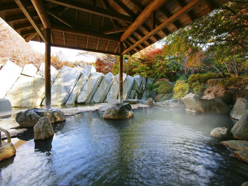 A 30 minutos en coche de la estación de Sendai. Ubicado en el punto más alto del complejo termal de Akiu, desde la ventana se extiende el verde fresco de un enorme jardín japonés. Las aguas termales naturales y el baño al aire libre en una parte del jardín se transforman en un paisaje de fantasía gracias a la iluminación de los árboles circundantes.
