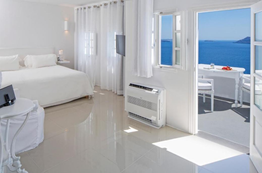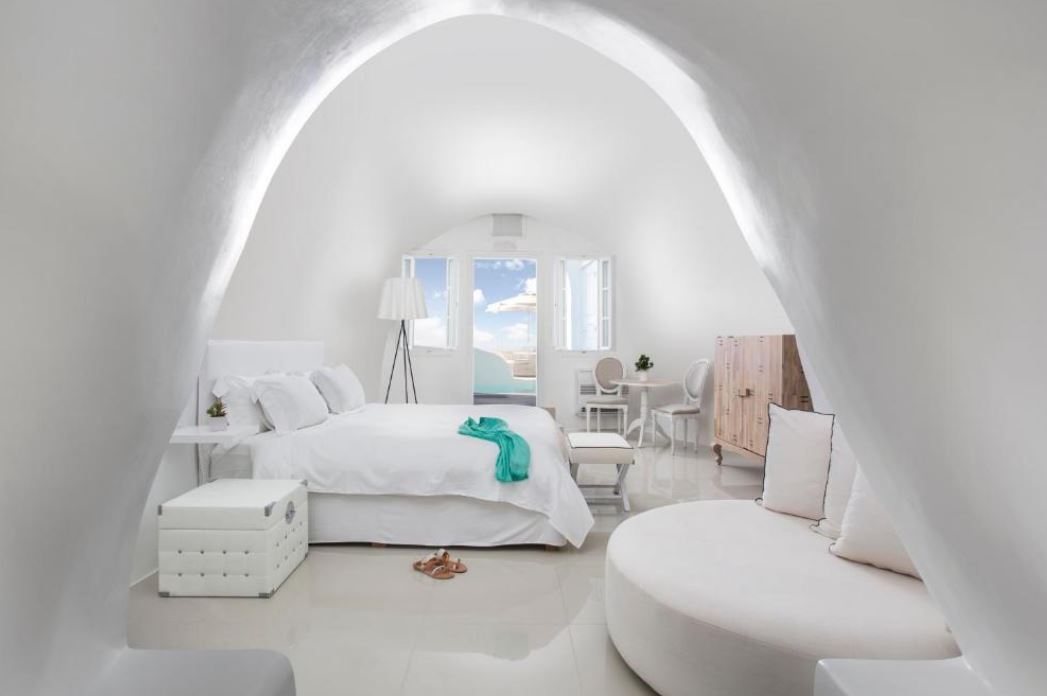 Las suites, que han sido redecoradas recientemente, ofrecen un ambiente sereno y cuentan con suelos de madera, camas mullidas y artículos de baño de lujo. Desde los balcones de todas las suites, se puede admirar las fascinantes vistas de la Caldera.