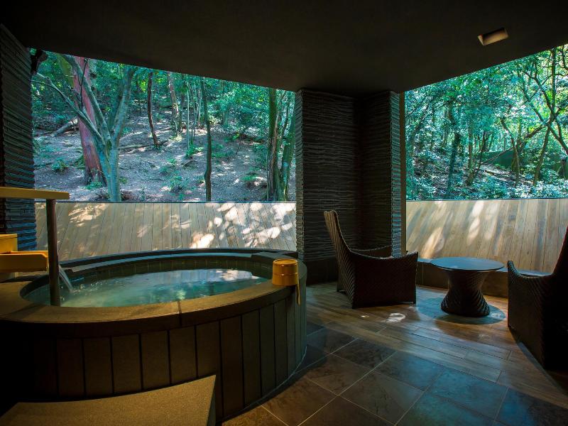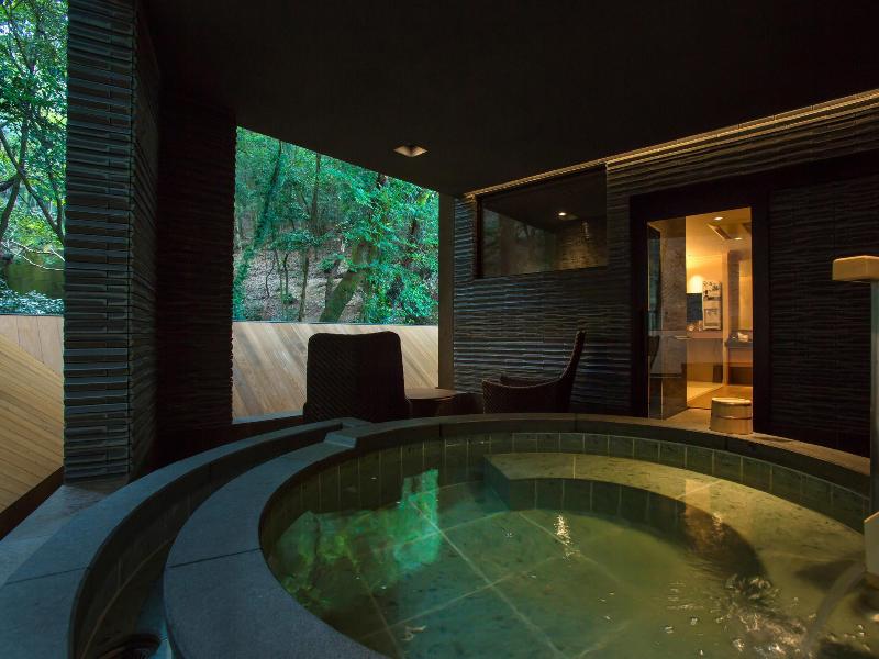 Derrochamos por la habitación privada en el Kaden onsen, y pasamos la noche sentado en un jacuzzi privado en el balcón, bebiendo sake frío y viendo el otoño niebla.