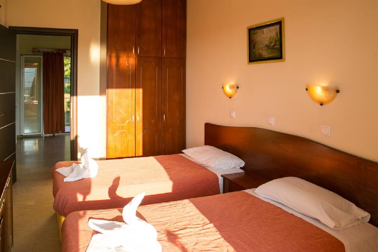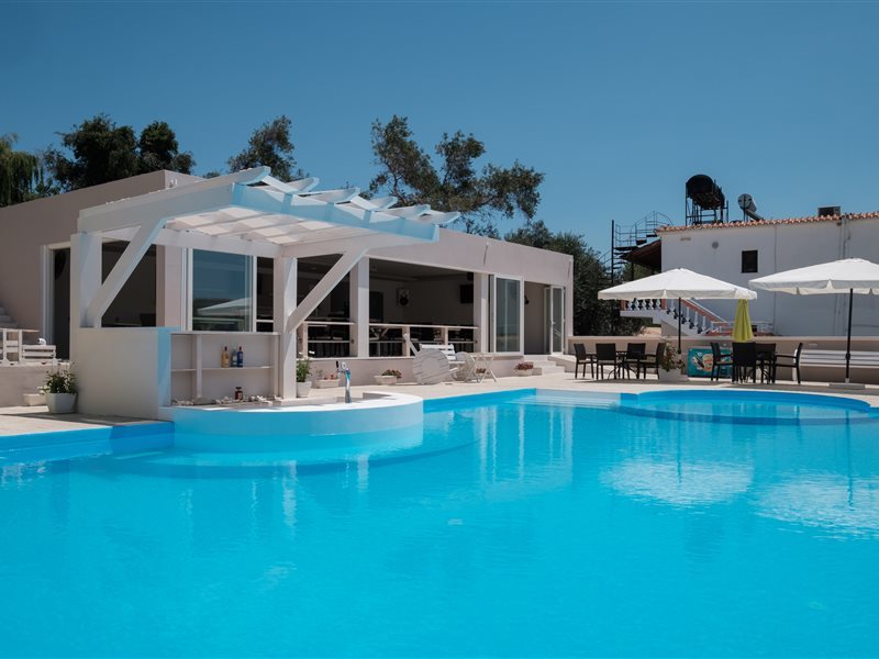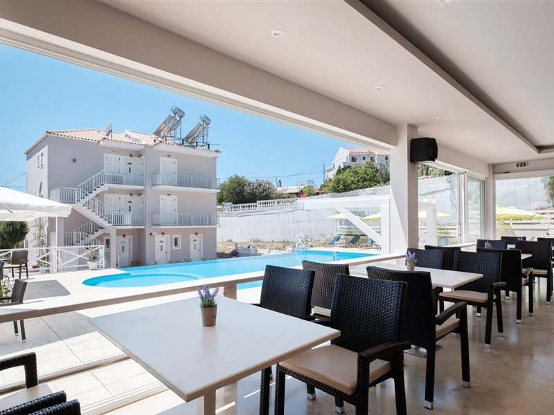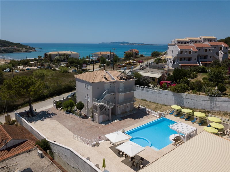 Kouros apts The apartments are located in the north-western part of the island, in the quiet resort of Agios Stefanos. Property is situated on a small hill with a beautiful view of Agios Stefanos and the Ionian Sea. Agios Stefanos, although it is a quiet and small resort, it offers guests taverns, shops and, above all, one of the most beautiful beaches of the whole of Corfu. Studios and apartments - a total of 8 - are located in a 2-storey building. Swimming pool and pool bar in the complex. It offers functionally furnished rooms. All with bathroom (shower), sat TV, kitchenette (fridge, stove, microwave, kettle, toaster, dishes, cutlery), balcony or terrace (table and chairs). Cot for children up to 2 years for free (on confirmation). Air-conditioning and Safe in the room free of charge.Studio - for max 2 people, one room, located on the ground floor.Apartments, located on the first and second floor. Wifi in all apartments with free access for guests.Long and sandy beach (gentle descent into the water) about 150 meters. Sunbeds and umbrellas on the beach are additionally payable.Cleaning is 5 times a week, change of towels is 3 times a week, and change of bed linen is 2 times a week.
