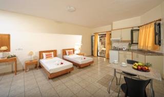 El apartotel se encuentra en la costa norte de Creta, a 32 km al este de Heraclion. Esta situado en el pintoresco vecindario del casco antiguo de Malia. Esta algo mas alejado, aunque se puede llegar a pie, de todos los lugares de interes para visitar, desde las tradicionales tabernas de la encantadora zona vieja, hasta los lugares para salir por la noche de la famosa carretera de la playa. Hay paradas de transporte publico a poca distancia a pie y la playa de Malia esta a aproximadamente 1 km. El aeropuerto internacional de Heraclion dista aproximadamente 32 km.Este moderno complejo hotelero, regentado por una familia, cuenta con un edificio principal y de tres edificios anejos de 2 plantas. Hay un chiringuito donde los huespedes pueden disfrutar de sus bebidas favoritas, asi como de aperitivos variados y platos locales, durante todo el dia y hasta tarde. Igualmente, en la zona del chiringuito, hay una TV via satelite de pantalla gigante, una mesa de billar, una zona con conexion a Internet WiFi (gratis), un telefono y servicio de cambio de divisas. Hay tambien una amplia zona de aparcamiento disponible junto al hotel. Este hotel de playa, renovado en 2010, comprende un total de 43 habitaciones que incluyen 18 apartamentos y 25 estudios. Dispone de vestibulo con servicio de salida 24 horas. Tambien hay un quiosco de prensa y una cafeteria a disposicion de los huespedes.El hotel ofrece habitaciones comodas y amplias con una decoracion moderna (habitaciones Deluxe), o clasica (habitaciones Superior), o bien un estilo mas tradicional (habitaciones Standard). Todas las habitaciones cuentan con una pequena cocina perfectamente equipada con una nevera, zona de comedor, un cuarto de bano privado con ducha, TV via satelite-por cable de pantalla plana y balcon o terraza. Tambien hay aire acondicionado y caja fuerte, ambos sujetos a un cargo extra. Otras comodidades incluidas son secador de pelo, cama doble y calefaccion regulable.