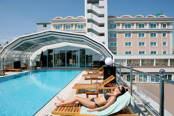 Instalaciones - Los huéspedes se sentirán como en su casa en una de las 92 habitaciones. Es posible acceder a las plantas cómodamente en ascensor o bien por las escaleras. Las instalaciones incluyen un restaurante, un bar, servicio de habitaciones, una sala de conferencias y un centro de negocios. Aquellos que viajen con vehículo propio pueden dejarlo en el aparcamiento del hotel.. Habitaciones - En el alojamiento hay disponibles habitaciones con aire acondicionado, calefacción central y cuarto de baño. Se pueden solicitar camas supletorias. Además, hay una caja fuerte. Para disfrutar de una estancia agradable, también se ofrecen una mini nevera y una cafetera/tetera. Para que el huésped disfrute de un confort óptimo, se ofrecen conexión a Internet, un teléfono y un televisor. Una ducha y una bañera se incluyen en el equipamiento de los cuartos de baño. Además, hay un secador de pelo.. Deporte y ocio - En su tiempo libre, los huéspedes pueden hacer uso de la piscina cubierta o de la piscina al aire libre. Hay sombrillas a disposición de los huéspedes. La bañera de hidromasaje en la zona de baño promete una relajación total. Las actividades de ocio ofrecidas proporcionan variedad; estas incluyen un gimnasio, un spa y un salón de belleza. Las opciones de entretenimiento también incluyen club infantil. Comidas - El establecimiento ofrece, como servicio gastronómico, la posibilidad de reservar media pensión y pensión completa. Los huéspedes pueden escoger entre desayuno, almuerzo y cena.. Tarjetas de crédito - En el hotel se aceptan las siguientes tarjetas de crédito: Visa y MasterCard..