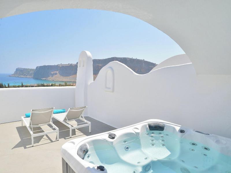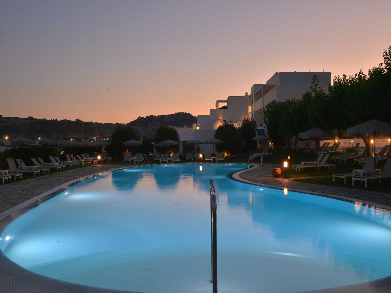 Este encantador hotel goza de una ubicación privilegiada en la isla, en medio de una hermosa bahía, a 800 m de la pintoresca bahía y la iglesia de St. Paul's, a 1 km del pueblo de Lindos y a 2 km de Pefkos. El Aeropuerto de Diagoras se encuentra a unos 50 km del hotel, cuyo interior combina la elegancia sencilla con el estilo griego clásico. El hotel, de estilo bungalow, ofrece 40 habitaciones, todas con balcón o terraza privados. Las habitaciones son elegantes y mantienen la sencillez característica de las islas griegas, pero están equipadas con todas las comodidades modernas. La piscina está rodeada de jardines, con el fondo de la roca volcánica roja de la ladera de la montaña, y ofrece vistas a la espectacular bahía de Psaltos. Puedes disfrutar de una copa en el bar de la piscina y relajarte en las tumbonas y sombrillas disponibles.