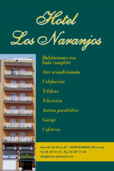 El Hotel Los Naranjos ** dispone de 35 habitaciones, individuales, dobles y triples. Todas ellas tienen baño completo, televisión, antena parabólica, calefacción, aire acondicionado, teléfono etc. Estamos situados dentro de Gandía ciudad, por lo que es ideal para estancias por razones de trabajo, celebraciones familiares y vacaciones, siempre con un trato familiar y personalizado. El Hotel Los Naranjos ** se encuentra situado a 5 minutos de la estación de trenes y autobuses, a 10 minutos del centro de la ciudad y a 3,5 km de la playa de Gandía. La zona cuenta con numerosas atracciones, entre ellas Palacio Ducal de los Borja y Playa de Gandía.