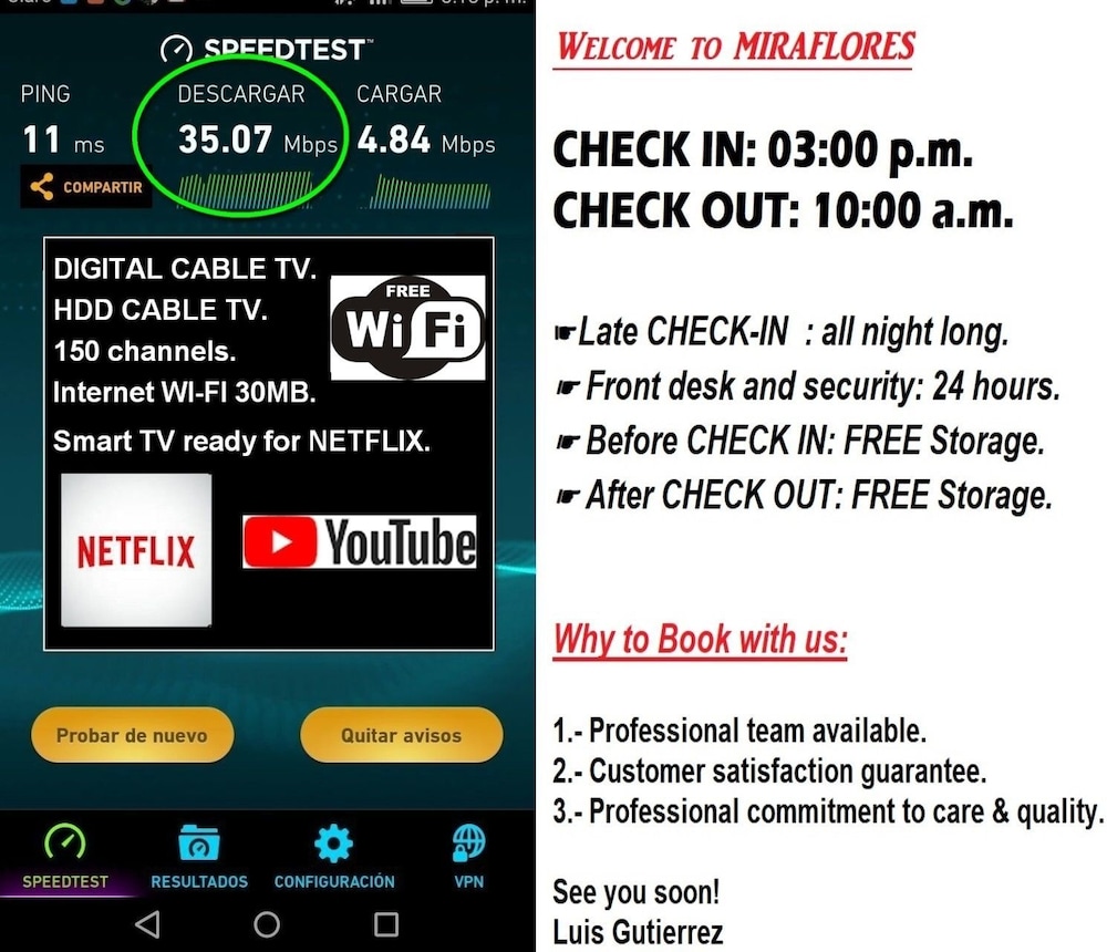 Si decides alojarte en este apartamento, te encontrarás en una fantástica zona de Lima (Miraflores), a solo unos pasos de Avenida Larco y a apenas 3 min a pie de Parque Central de Miraflores. Además, este establecimiento se encuentra a 0,2 km de Iglesia Virgen Milagrosa y a 0,5 km de Museo Sala Luis Miro Quesada Garland. Regálate una estancia fantástica en este apartamento donde, además de aire acondicionado, tendrás una cocina perfectamente equipada con horno y placa de cocina. Podrás conectarte a Internet wifi o por cable gratis y disfrutar de un Smart TV de 50 pulgadas que te permitirá acceder a multitud de canales digitales. Tendrás una caja fuerte y un escritorio, así como un teléfono desde el que podrás realizar llamadas locales gratuitas. Tendrás conexión a Internet de alta velocidad por cable (gratuita), check-in rápido y check-out rápido a tu disposición. Hay un aparcamiento sin asistencia gratuito disponible.