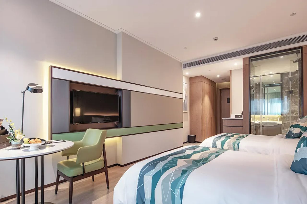 The room amenities include a desk, towels, a television, and a private bathroom.