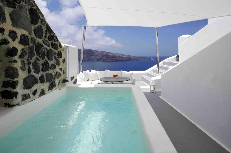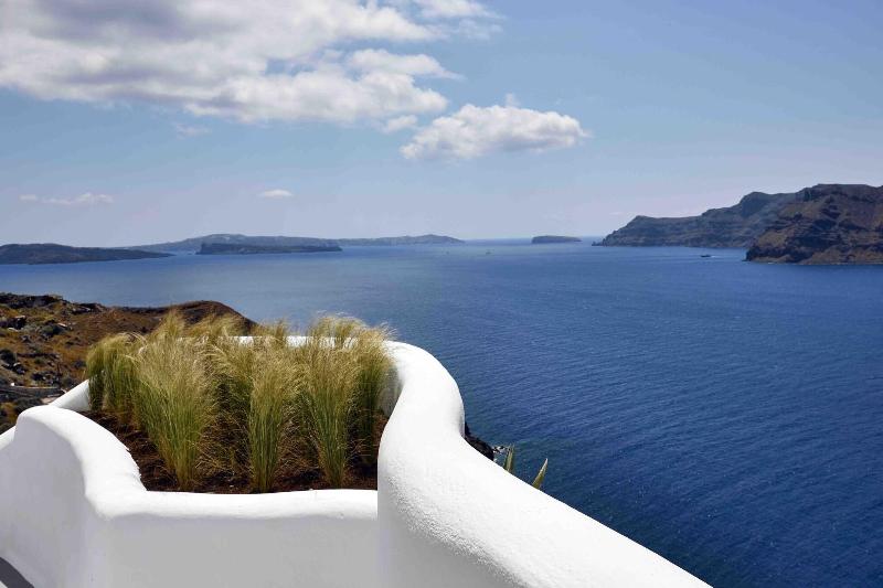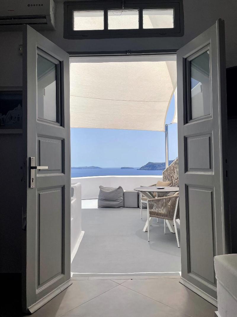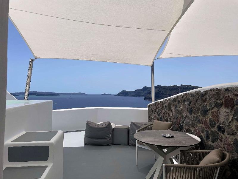Ubicado en lo alto de un acantilado con vistas a la hermosa caldera de Santorini, en la lo...