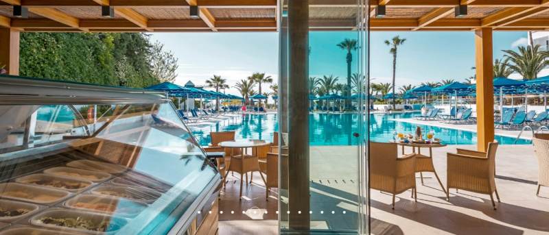 This hotel is ideally situated on the east coast, next to the town of Faliraki and close to the beautiful sandy beach, 5 km from the Afandou golf course (18 holes) and only 14 km to the town of Rhodes, where the Casino is.