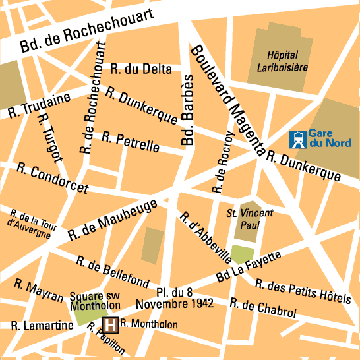Desde el aeropuerto se puede llegar al hotel mediante taxi, metro (L-07 Cadet, L-07 Poissonirees, L-12 Notre Dame de Lorette), Bus (26,42,43) y tren (Gare du Nord, Gare de L'Est,Gare de Lyon).