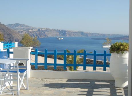 Ubicado en lo alto de un acantilado con vistas a la hermosa caldera de Santorini, en la lo...