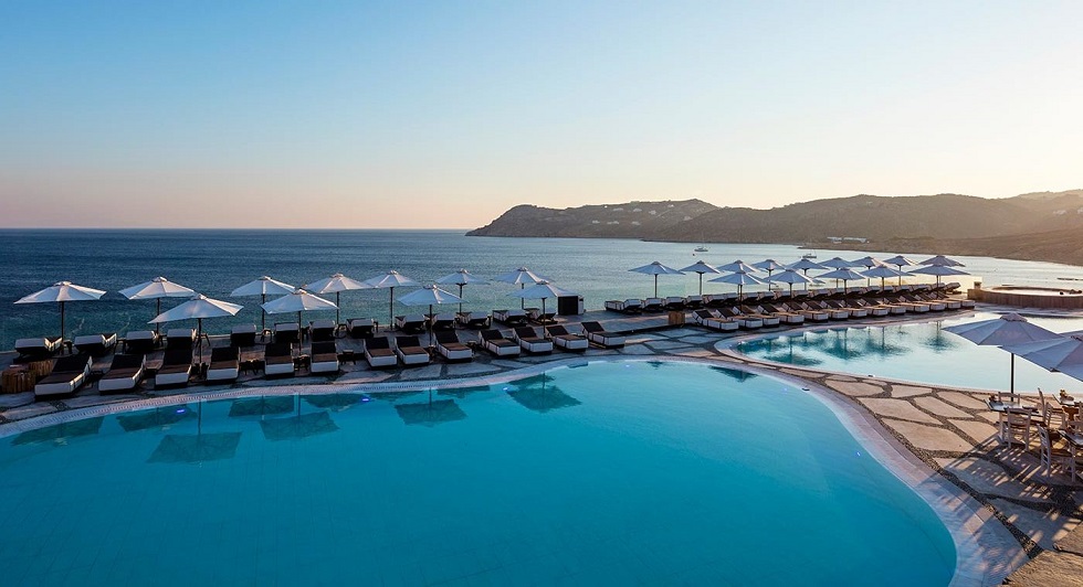 Ubicación - Este lujos hotel, situado en la isla de Mykonos, está a solamente 50 metros de la isla Elia, así como a unos tres kilómetros del centro de la localidad de Ano Mera. La ciudad de Mykonos, a la que podrá llegar fácilmente y sin ningún problema en autobús, está a 12 kilómetros. La parada de autobús más cercana está a unos minutos andando (a 300 metros). En una media hora puede llegar al aeropuerto de Mykonos con el autobús del hotel.. Instalaciones - El hotel se construyó en el año 2002. Los huéspedes se alojan en 118 habitaciones. Las distintas plantas del establecimiento son accesibles en ascensor. Servicios como una caja fuerte y una oficina de cambio ayudan a proporcionar una estancia confortable. Los huéspedes pueden conectarse a Internet en las zonas públicas mediante Wi-Fi. En cuanto a opciones gastronómicas, el alojamiento cuenta con un restaurante, un comedor, una sala de desayunos, una cafetería y un bar. Hay comercios. En el recinto del hotel hay un precioso jardín y un parque infantil. Las instalaciones del establecimiento también incluyen un quiosco de prensa, una sala de TV y una sala de juegos. Aquellos que viajen con vehículo propio pueden dejarlo en el aparcamiento del alojamiento. La oferta disponible incluye asistencia médica, servicio de habitaciones, una lavandería y una peluquería.. Habitaciones - En las habitaciones hay aire acondicionado, calefacción central y un cuarto de baño. En la mayoría de las habitaciones es posible disfrutar de las vistas desde un balcón. Los huéspedes podrán dormir cómodamente en una cama king size. Además, hay una caja fuerte y un minibar. Asimismo, hay disponibles una nevera y una mini nevera. Hay un set de plancha para mayor comodidad de los huéspedes. El equipamiento se completa con conexión a Internet, un teléfono, un televisor, una radio y un equipo de música. Es posible reservar habitaciones aptas para personas en silla de ruedas. Los cuartos de baño cuentan con una ducha y una bañera. Las comodidades incluyen un secador de pelo. También es posible reservar cuartos de baño accesibles. Hay habitaciones familiares especiales para familias con niños.. Deporte y ocio - Los días más calurosos, los huéspedes pueden disfrutar de un refrescante chapuzón en la piscina cubierta o la piscina al aire libre. La terraza para tomar el sol, las tumbonas y las sombrillas son perfectas para unas vacaciones relajadas. La bañera de hidromasaje en la zona de baño promete una relajación total. En el bar de piscina se ofrecen bebidas refrescantes. Los huéspedes que no deseen renunciar al deporte durante su viaje se divertirán practicando equitación. El programa de deportes acuáticos del hotel incluye esquí acuático, windsurf, moto acuática, banana acuática y submarinismo. La oferta deportiva y de ocio del establecimiento incluye gimnasio, ping-pong y squash. El alojamiento cuenta con diferentes ofertas de bienestar, como spa, sauna, baño de vapor, masajes y solárium. Copyright GIATA 2004 - 2016. Multilingual. Comidas - El hotel ofrece una gran selección de opciones gastronómicas. Se puede reservar alojamiento con desayuno, media pensión y pensión completa. Se ofrece desayuno, almuerzo y cena. Se preparan platos dietéticos y platos vegetarianos a petición.. Tarjetas de crédito - Como forma de pago se aceptan las tarjetas de crédito habituales como, por ejemplo, American Express, Visa, Diners Club y MasterCard..