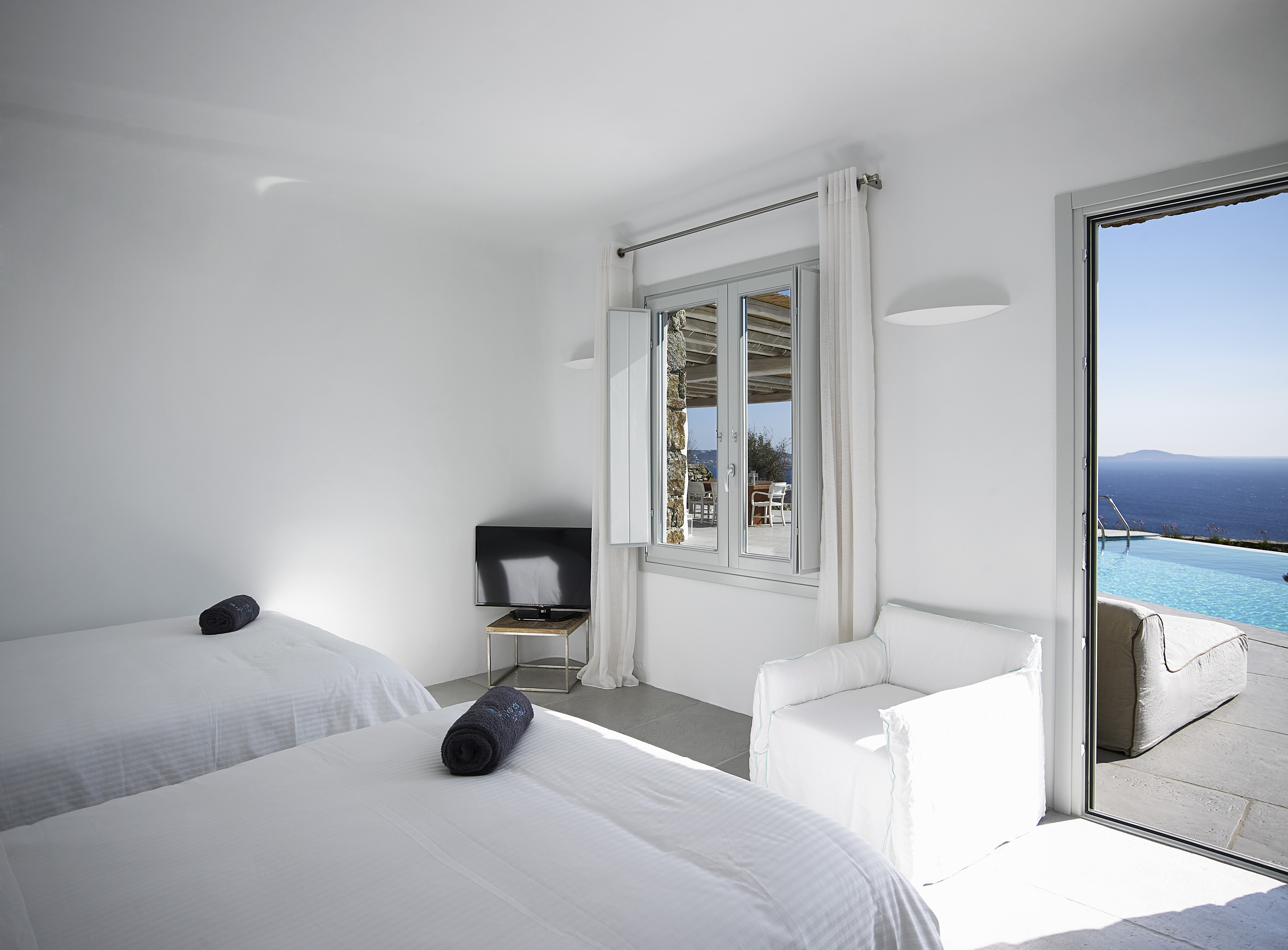 La arquitectura y el diseño interior son tradicionales de las Cícladas y minimalistas, pero con un carácter distintivo. Salas de estar luminosas, amplias y aireadas, comedores cómodos, cocinas modernas completamente equipadas y habitaciones con baño discretamente lujosas, ofrecen elegancia, comodidad, funcionalidad y una sensación de bienestar. Muebles cuidadosamente seleccionados y piezas decorativas únicas completan el ambiente refinado pero acogedor y relajado.