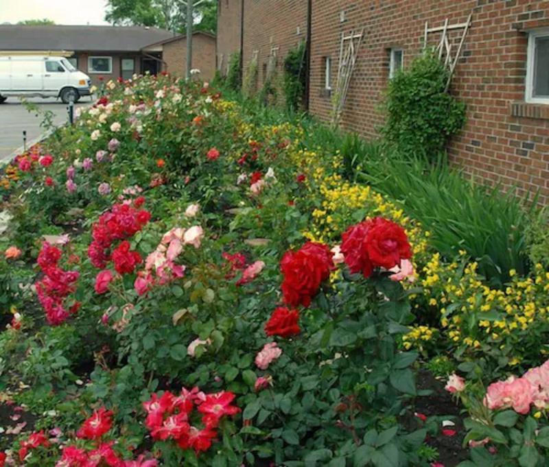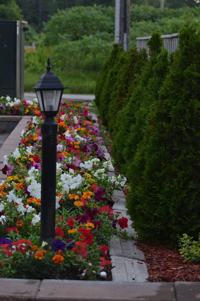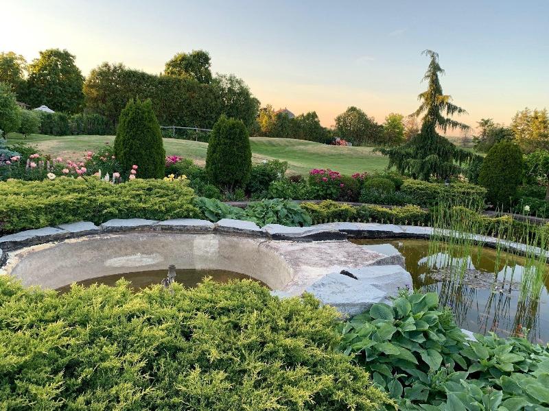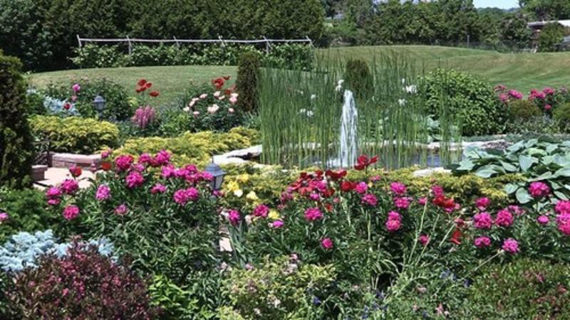 Bonitos jardines. un montón de jardines de flores y estanques con fuente.