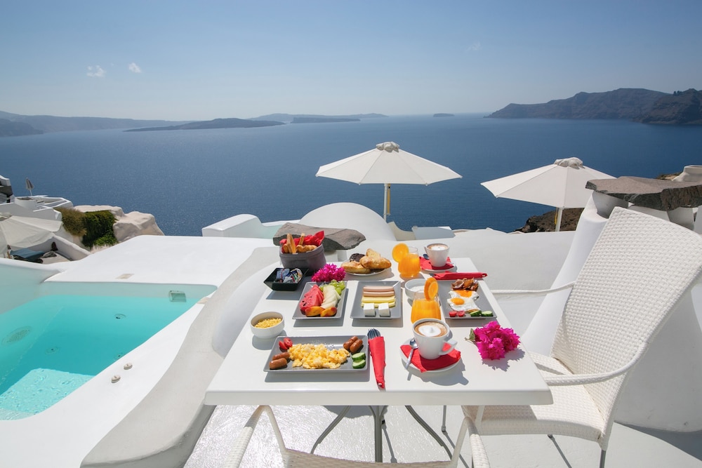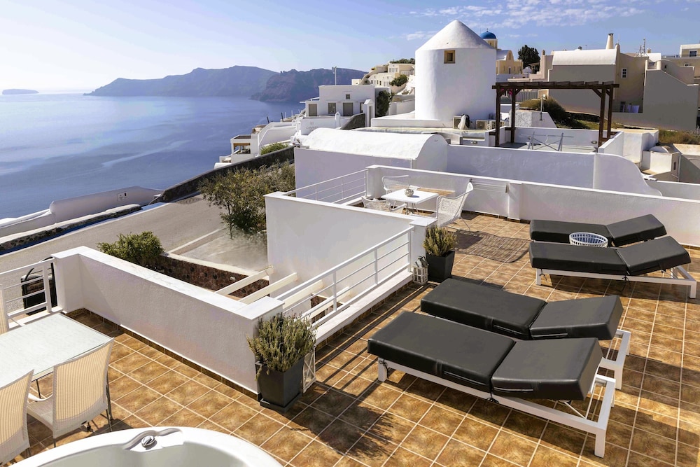 Ubicado en lo alto de un acantilado con vistas a la hermosa caldera de Santorini, en la lo...
