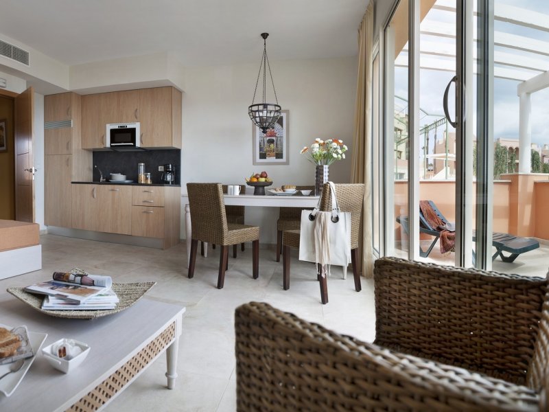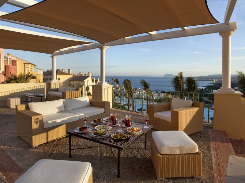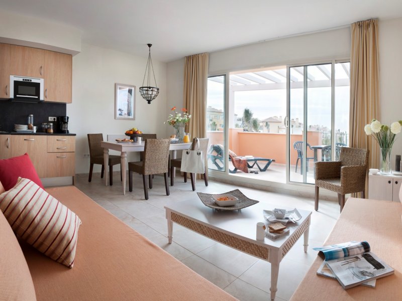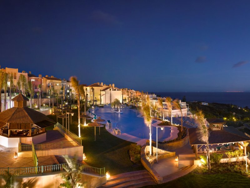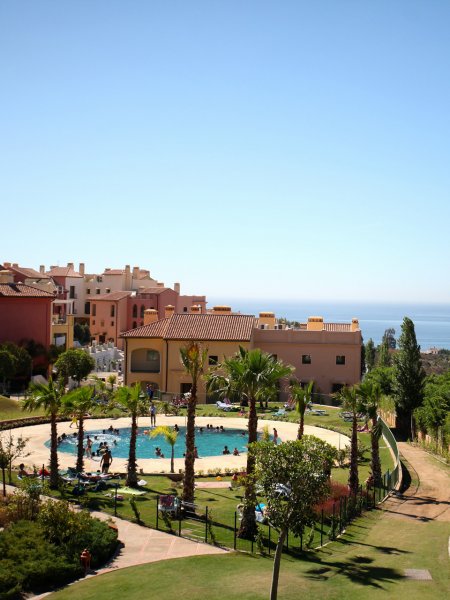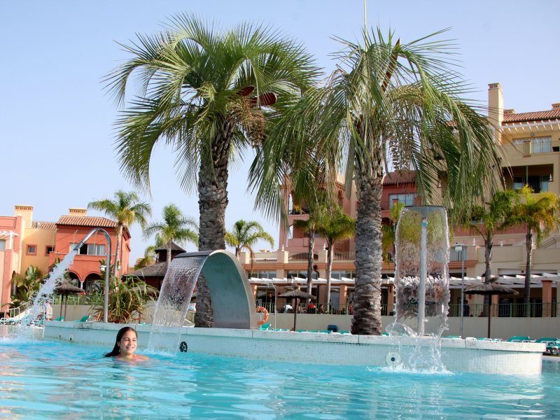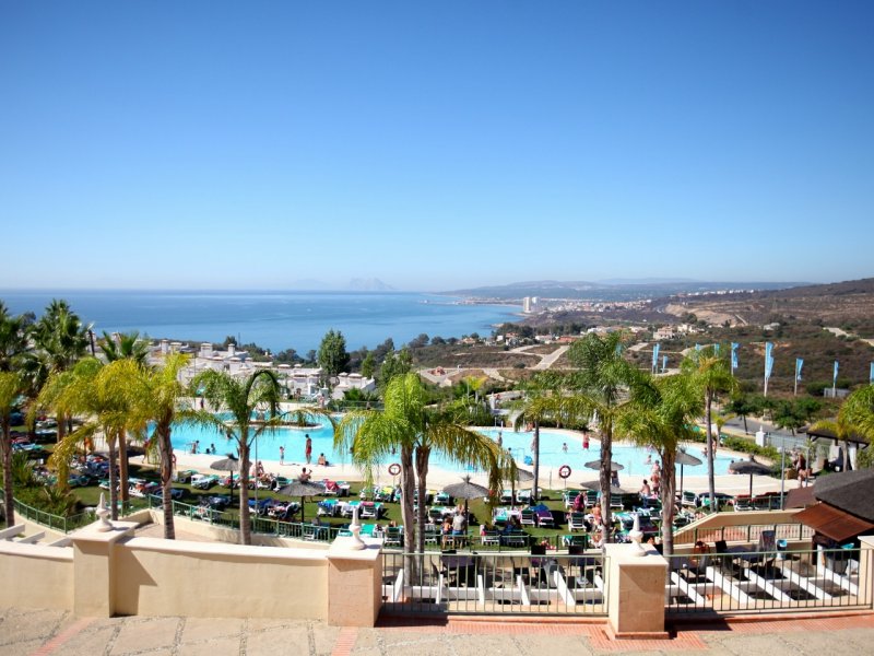 La ciudad de vacaciones, situada en la celebre Costa del Sol, esta en la zona de Manilva, a unos 50 km de Marbella. Queda a 55 minutos del aeropuerto de Malaga (a aproximadamente 110 km) y a 20 minutos del aeropuerto de Gibraltar.La ciudad vacacional estilo complejo esta realizada al estilo de una aldea andaluza con su caracteristica arquitectura e incorpora varios edificios de distintos colores rodeados por vegetacion autoctona. Este magnifico complejo abrio sus puertas en 2009 y se construyo en distintos niveles siguiendo el formato de un anfiteatro con patios, estanques, fuentes y jardines. Ofrece un parque infantil y numerosas actividades gratuitas como club infantil para ninos de entre 3 y 15 anos de edad y el club Spot, para jovenes de entre 13 y 18 anos en Julio y Agosto. En recepcion se proporcionan servicio de limpieza, servicio de lavanderia (de pago), set de bebes y conexion a Internet WiFi (por un suplemento). El establecimiento climatizado, construido en 2009, cuenta con 328 apartamentos, vestibulo con recepcion 24 horas, caja fuerte, guardarropa, auditorio, sala de TV, cafeteria y bar. Los huespedes que lleguen en coche podran dejar su vehiculo en el aparcamiento o garaje (este ultimo, de pago).Todos los apartamentos disponen de una cocina bien equipada con vitroceramica de 4 fuegos, nevera, microondas, lavavajillas, cafetera-tetera y hervidor de agua electrico. Los apartamentos cuentan con TV via satelite con canales internacionales, aire acondicionado regulable, calefaccion y terraza con mobiliario de jardin. Ademas, hay telefono, cama doble y caja fuerte (por un suplemento). Los cuartos de bano privados vienen con banera.Miniclub desde los 4 anos
