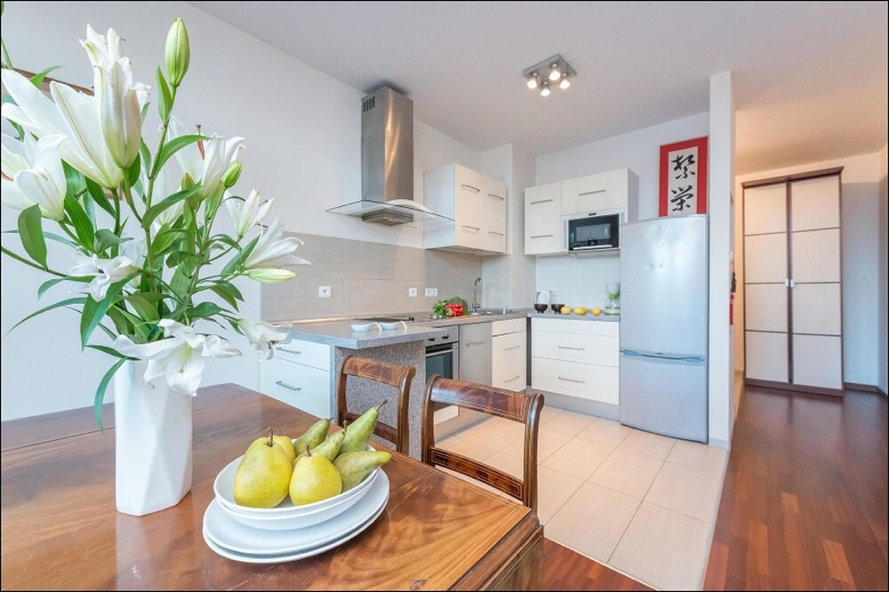 Un apartamento de lujo en pleno corazn de Varsovia, muy funcional y moderno, ubicado en el prestigioso edificio M2. Tiene dos habitaciones espaciosas. El cuarto de estar con una terraza muy grande con vistas estupendas de donde se puede apreciar todo el centro de la ciudad. Apartamento muy acogedor, ideal para descansar del ruido callejero. Ventanas muy grandes reducen el ruido de la calle y hacen el apartamento an ms espacioso. El cuarto de bao plenamente equipado orientado hacia confort y disfrute de nuestros huspedes. La cocina enteramente equipada en electrodomstico, vajilla y utensilios para que puedan preparar la comida que ms les guste.Apartamento con aire acondicionado.Apartamento de lujo y estndar muy altoApartamento enteramente equipado, de estndar muy altoCocina equipada: placa por induccin, nevera, horno, microondas, lavavajillas, mesa, sillas, sombrereteCuarto de bao: cabina de ducha 90x120, wter, lavabo, piso calentadoDormitorio: cama doble 180x200, puerta de estilo japonsCuarto de estar: sof-cama 140x200, cmoda, mesa para 6 personas, sillas, TV, DVD, estreo, CDVestbulo: armario, lavadoraInternet, Wi-Fi, LAN, televisin por cable, plancha, tabla de planchar, aspiradora, platosEl precio incluye toallas, sbanas y limpieza finalPersianasAire acondicionado