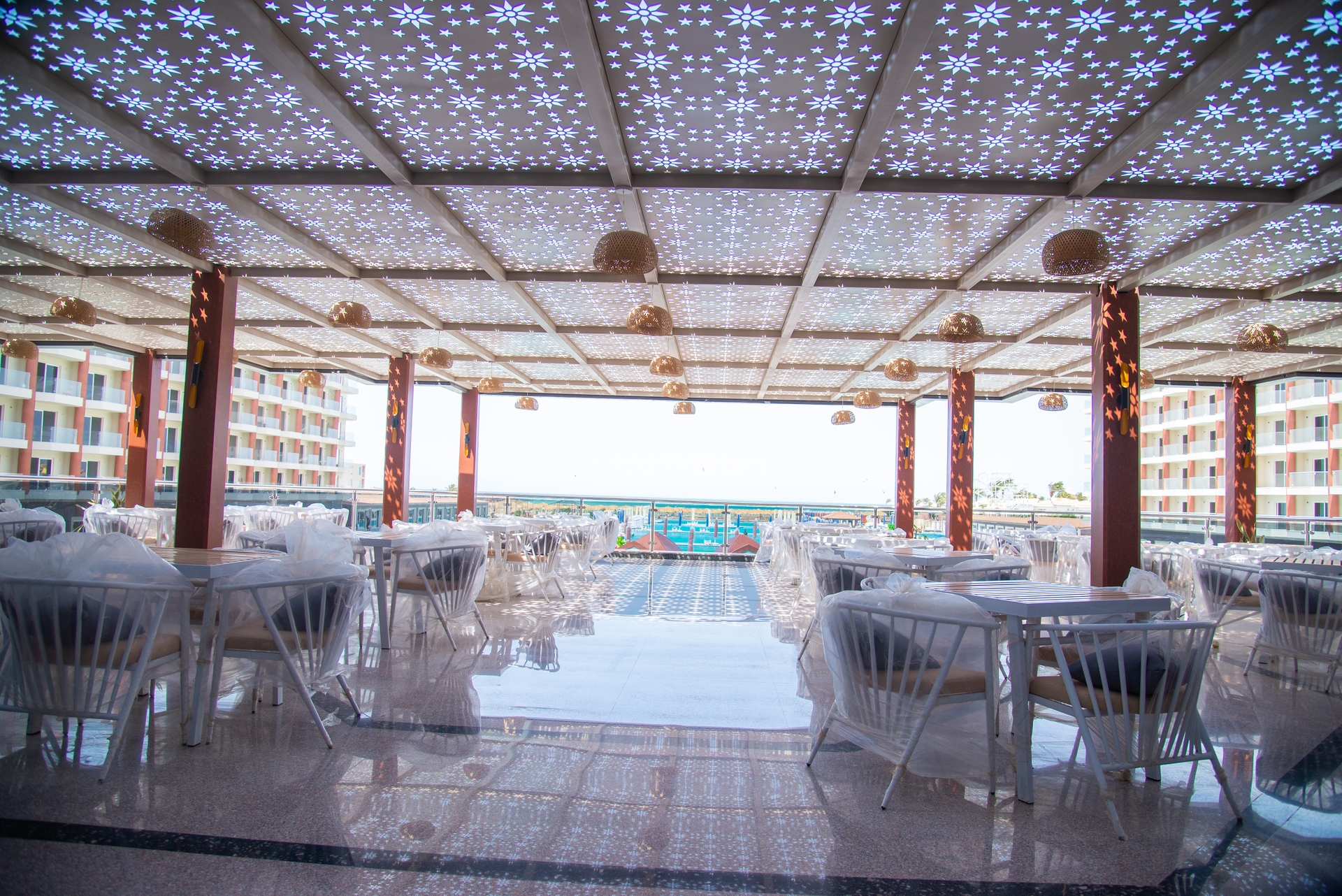 Deportes y actividades para el tiempo libre En el interior, un gimnasio espera su visita. También encontrará varios deportes acuáticos como el banana acuática y lancha rápida, moto acuática y aerobic acuático en las cercanías del hotel. Al lado, en las inmediaciones del recinto del hotel, hay una zona para practicar diversos deportes así como la posibilidad de alquilar equipamiento para montar a caballo. Si tampoco quiere renunciar a su entrenamiento durante las vacaciones, aquí encontrará un campo de fútbol. También puede hacer deporte en los cursos de aerobic y zumba y practicando el voleibol de playa. En el recinto del hotel existe también la posibilidad de jugar al billar. Con futbolín, dardos y tenis de mesa diversas clases de deportes aportan gran variedad a las vacaciones. A disposición de los ciclistas hay una tienda de bicicletas en la cual pueden adquirirse mapas para bicicletas. Como otras posibilidades de ocio se ofertan también el voleibol, yoga y la petanca. En las inmediaciones del hotel hay algunas hermosas rutas de senderismo, por las que -bajo petición- también puede ir acompañado por guías de senderismo profesionales. Además, en los alrededores pueden practicarse diversos deportes acuáticos como snorkel y buceo con nitrox (servicio de alquiler y lanzadera incluidos). Tanto principiantes como practicantes avanzados pueden entrenar, bajo supervisión, sus habilidades bajo el agua en una escuela de buceo. En la zona de playa también es posible hacer kitesurf A su disposición hay también, entre otros, un establecimiento de alquiler de artículos para el kitesurf, una tienda de kitesurf y una sala de almacenaje para su equipamiento. Su alojamiento es adecuado también para los practicantes de deportes de invierno. En la zona de deportes de invierno próxima, se encuentran también un establecimiento de alquiler de artículos para el esquí. Igualmente, aquí es también posible ir en trineo. La zona de spá incluye una sauna y ducha de hidromasaje. Aquí se ofrece también masajes, así como tratamientos de belleza. Déjese mimar en el hammam y encuentre tranquilidad en la sala de relajación. El hotel ofrece aplicaciones fango y terapias de oxígeno para su bienestar mental. Los niños pequeños pueden ser atendidos en el club de bebés propio del hotel. Para niños mayores el cuidado tiene lugar en el club de niños. También existe una guardería en el hotel. También hay un servicio de canguro en el hotel (de pago) . También en la mini-discoteca, los huéspedes más pequeños encontrarán un entretenimiento adecuado a su edad. Para el entretenimiento de los huéspedes adultos, hay se presentan espectáculos por la noche y música en vivo. Además, el hotel ofrece una sala de juegos para adultos. Más información La propiedad de 6 pisos, construido en el año 2025 consta de un edificio principal y 4 anexos con 6 pisos y cuenta con un total de 1055 habitaciones. 2 de las habitaciones son accesibles sin barreras arquitectónicas. El personal del hotel habla inglés, alemán, ruso y árabe.